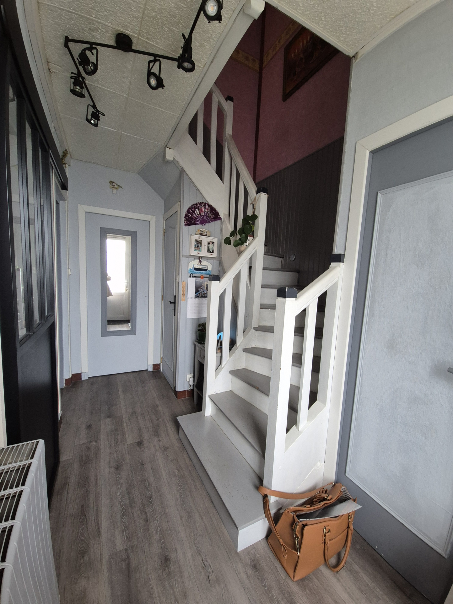 Maison comprenant : entrée avec placards + accès à la cave en sous-sol, couloir menant au 1er étage et à la partie magasin.