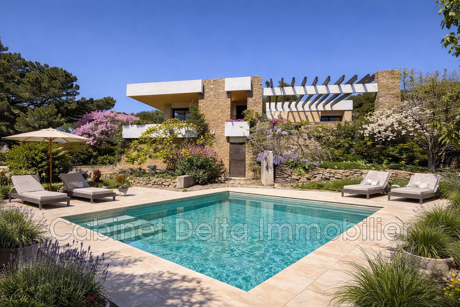 Superbe villa d'architecte de 200m² comprenant 5 chambres, un joli séjour avec larges baies vitrée ouvrant sur une de belles terrasses, terrain de 1200m² env, un garage, vue mer. Au calme<BR>Terrain piscinable (photo réalisée avec l'aide de l&...