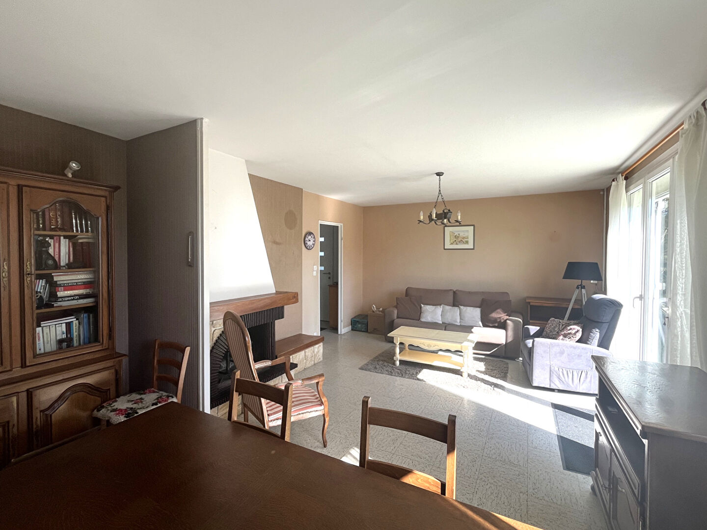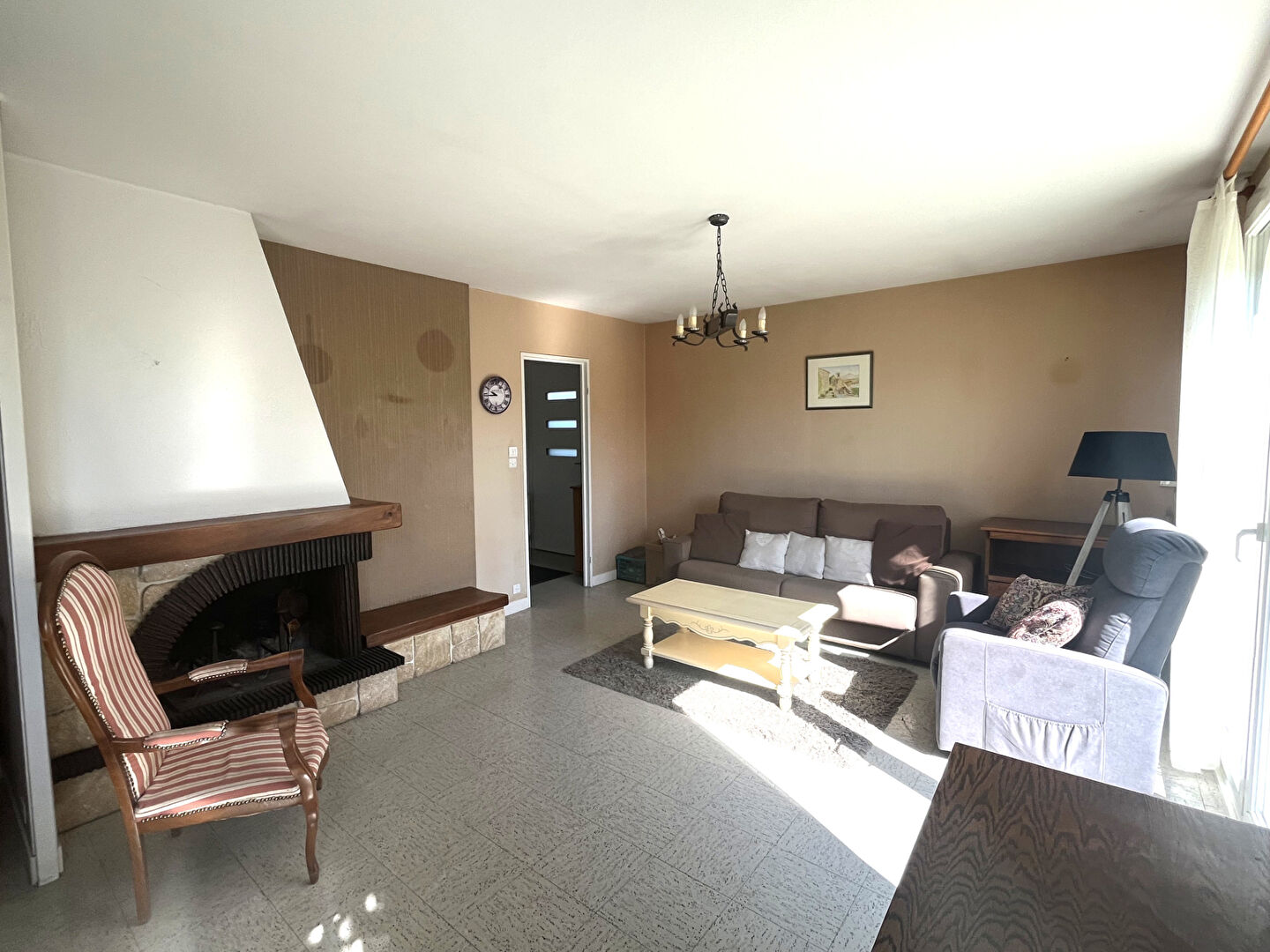 Salon, séjour, cuisine équipée, 3 chambres avec rangement, salle d'eau WC, garage attenant et joli jardin à l'arrière sans vis à vis avec terrasse carrelée.