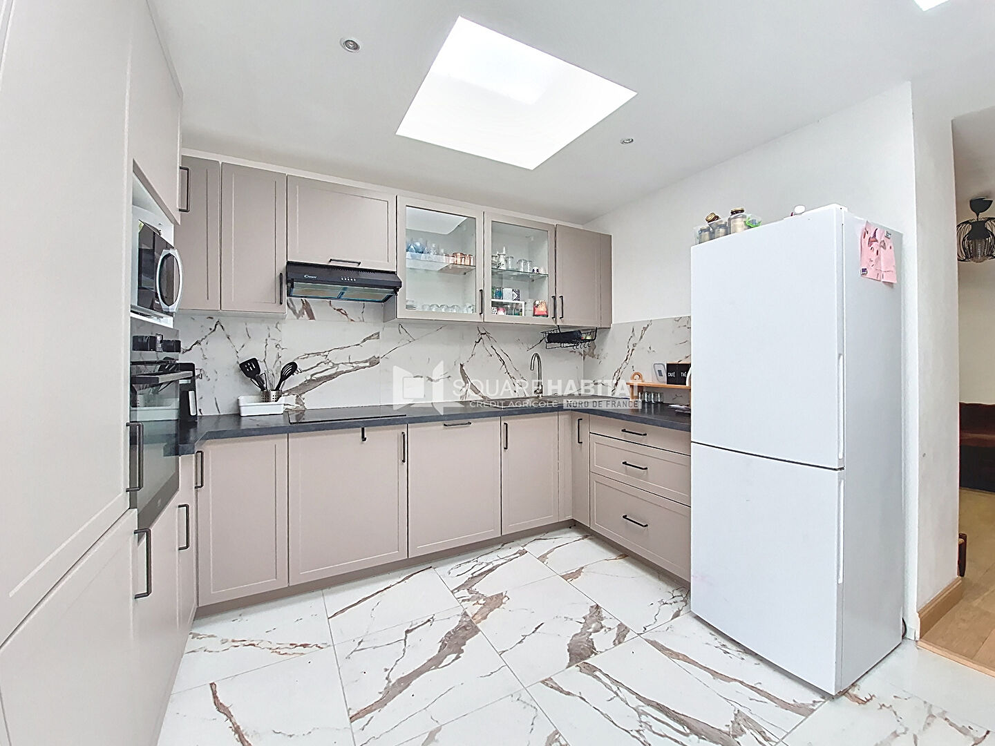 Passé le hall d'entrée, l'espace de vie offre une grande cuisine équipée ouverte sur le salon ainsi que la salle à manger.
