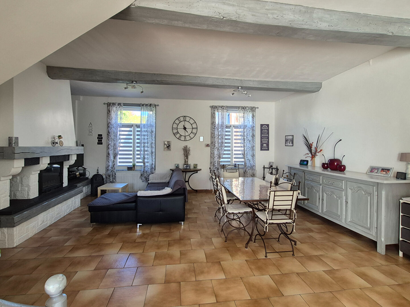 Grande pièce de vie chaleureuse avec cheminée et belle hauteur sous plafond, cuisine moderne avec ilot central, les deux donnant sur...