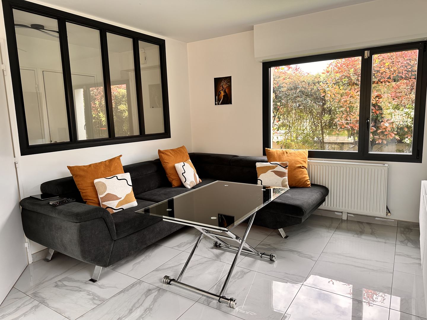 À l'intérieur, vous trouverez un salon lumineux grâce à ses grandes fenê...