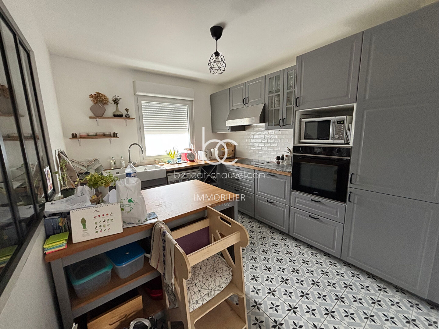 De plain pied, l'entrée dessert la cuisine, le salon et la salle à manger qui donne sur l'espace e...