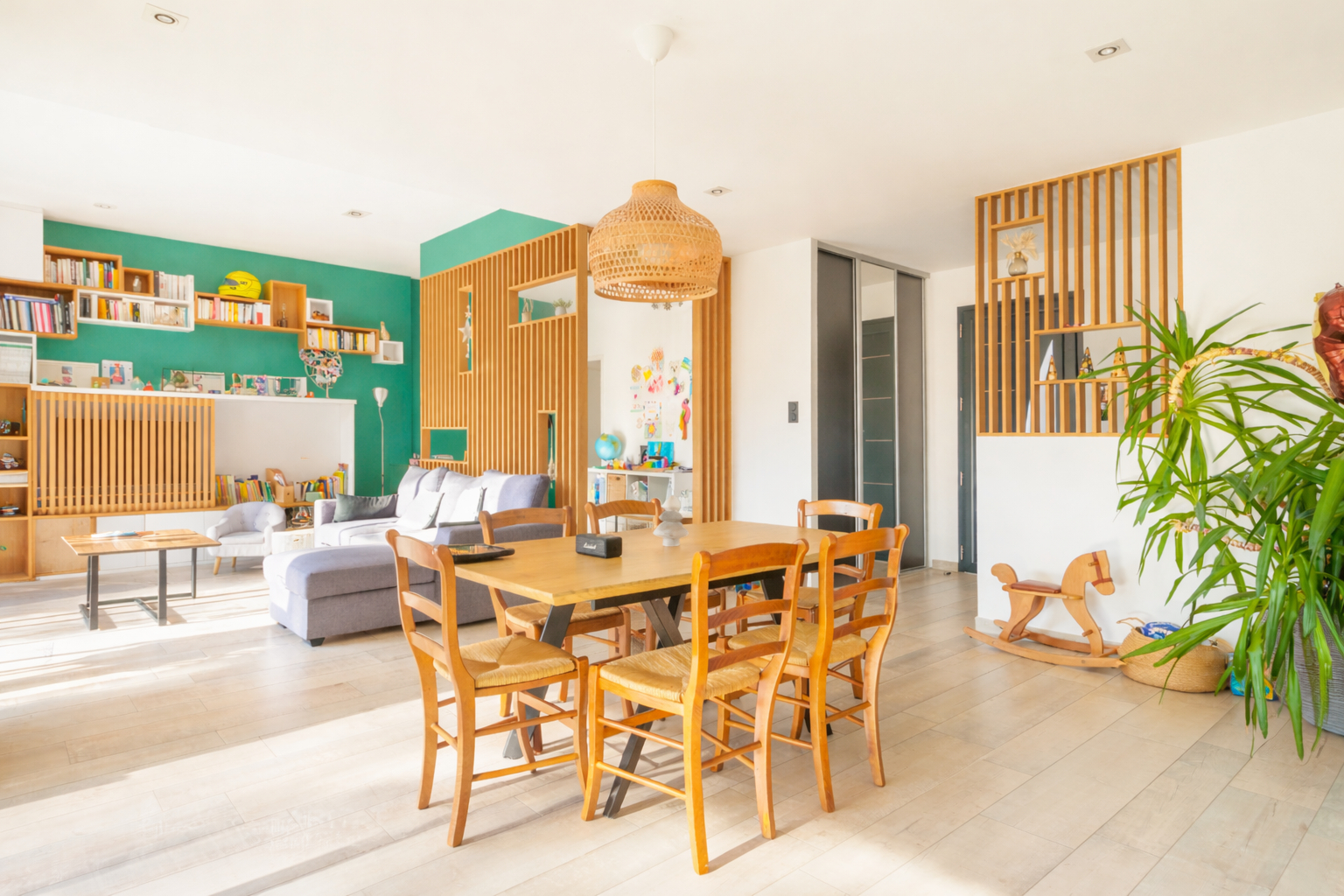Vaste pièce de vie lumineuse de 70 m2 avec salon, salle à manger, billard et cuisine moderne équipée.