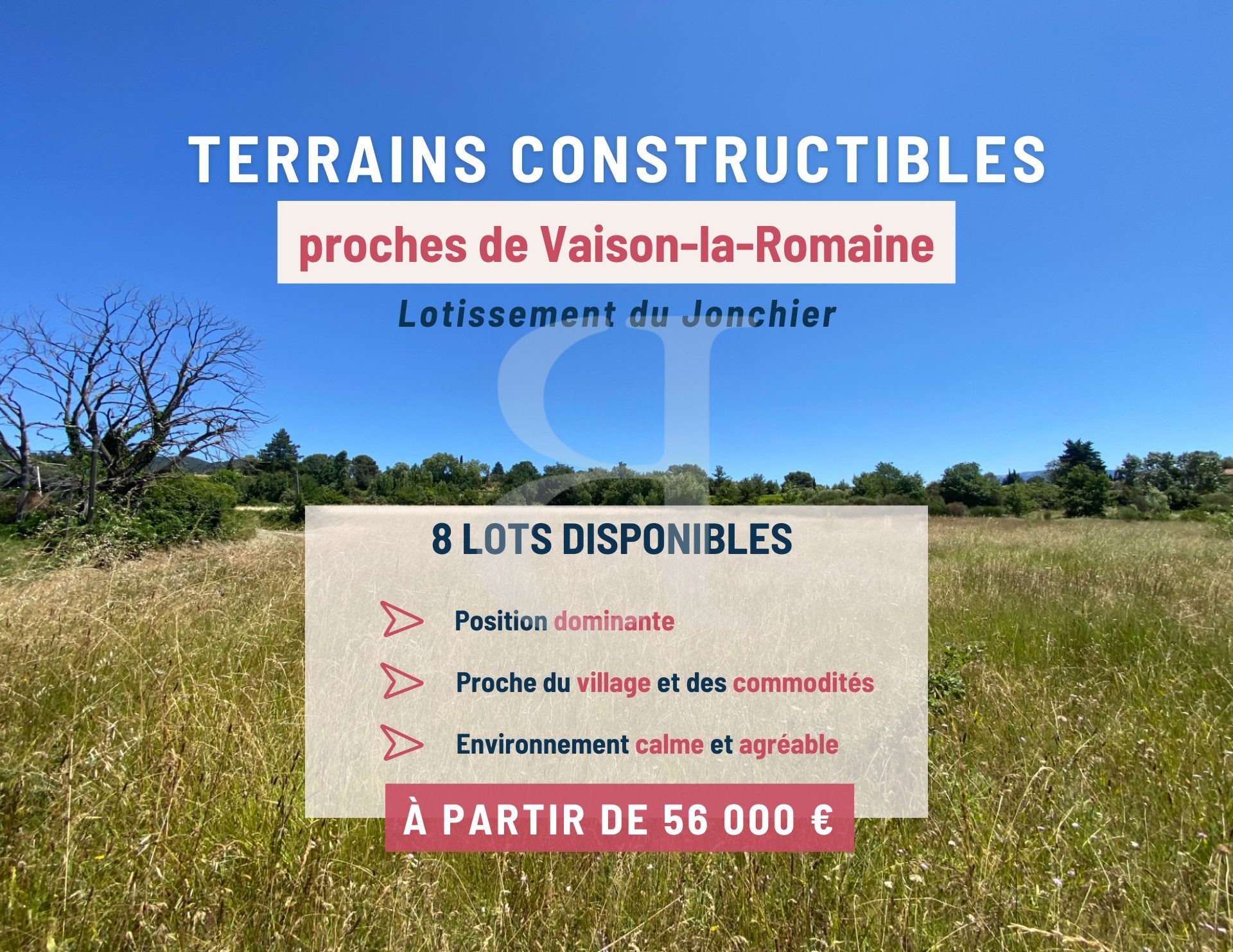 À l'orée d'un charmant village en position dominante, à proximité de Vaison-la-Romaine, nous vous proposons un nouveau projet de 8 terrains, vendus entièrement viabilisés, allant de 280 m² à 429 m², à partir ...