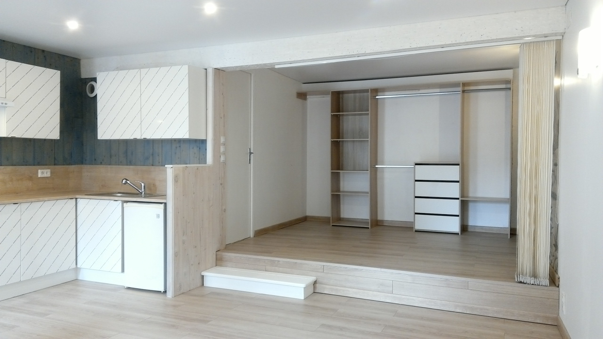 Entrée, Salle d'eau, Wc, Bureau, cuisine équipée, Salon- chambre avec placard