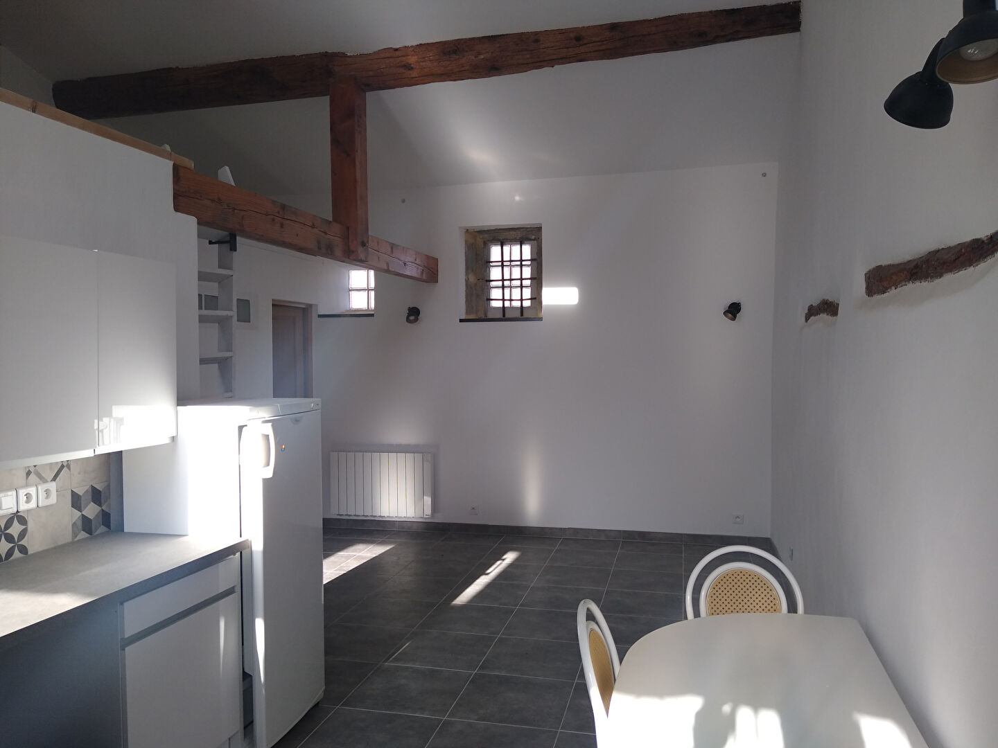 Appartement meublé de 43m² comprenant une mezzanine, une pièce de vie avec cuisine ouverte, salle d'eau avec WC. Situé au troisième et dernier étage d'un petit immeuble sans ascenseur en plein coeur du village.