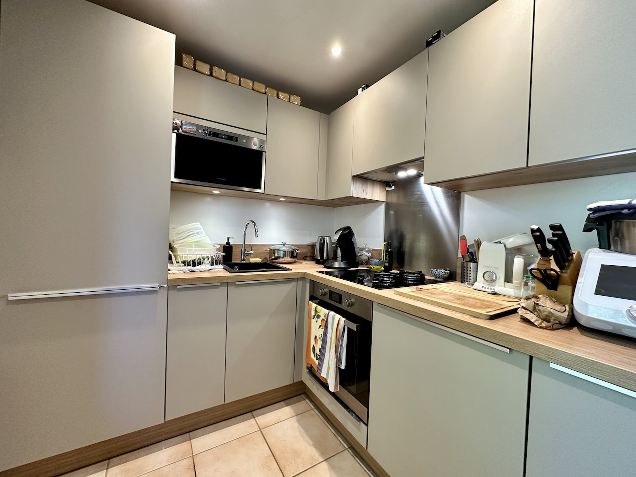 Entrée avec placard, séjour, cuisine entièrement équipée (four, plaque induction, hotte, lave vaisselle, machine à café, lave linge, réfrigérate...