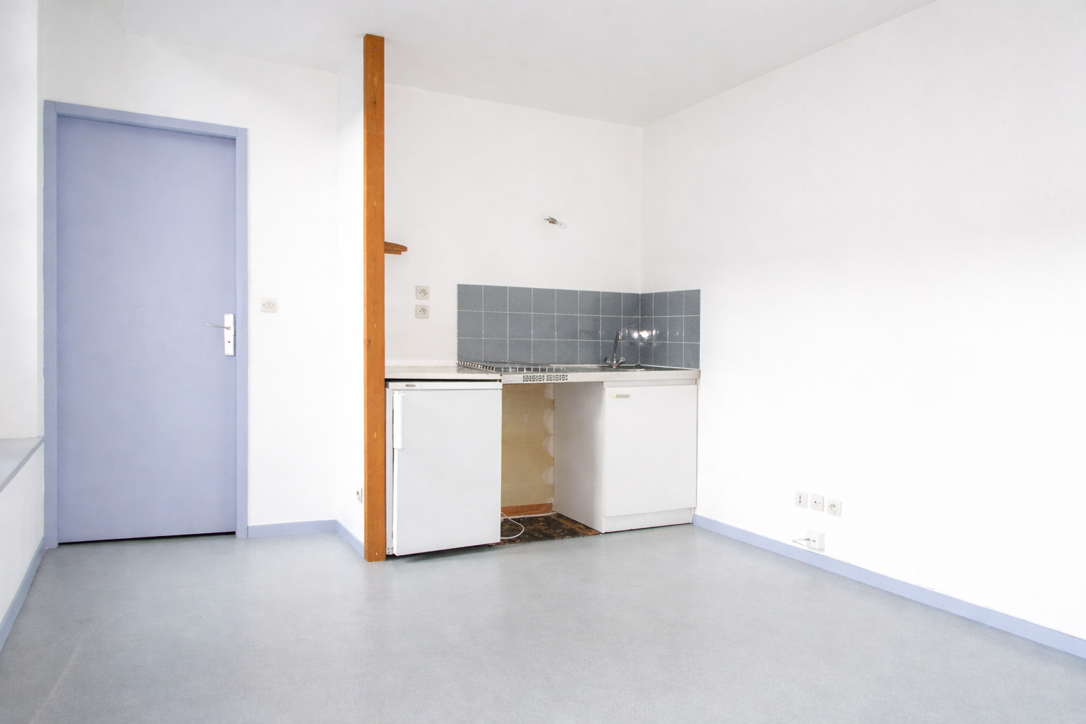 Pièce principale avec cuisine américaine et une chambre. Salle d'eau (douche).
