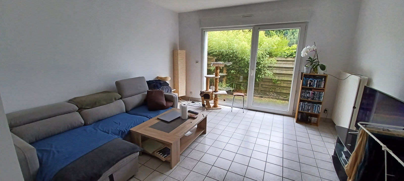 Au centre, appartement de type 3 en rez de jardin avec terrasse exposée plein sud, cuisine, salon-séjour, deux chambres, salle de bains, cave, place de parking. Chaudière gaz.