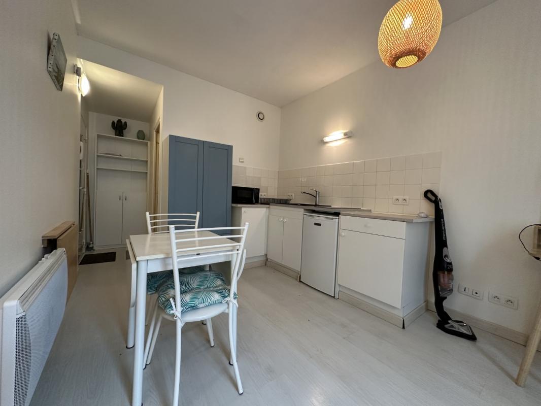 Studio entièrement rénové, situé au 1er étage d'un immeuble avec ascenseur comprenant salon avec cuisine aménagée, salle de bain avec WC, cave, places de parking.