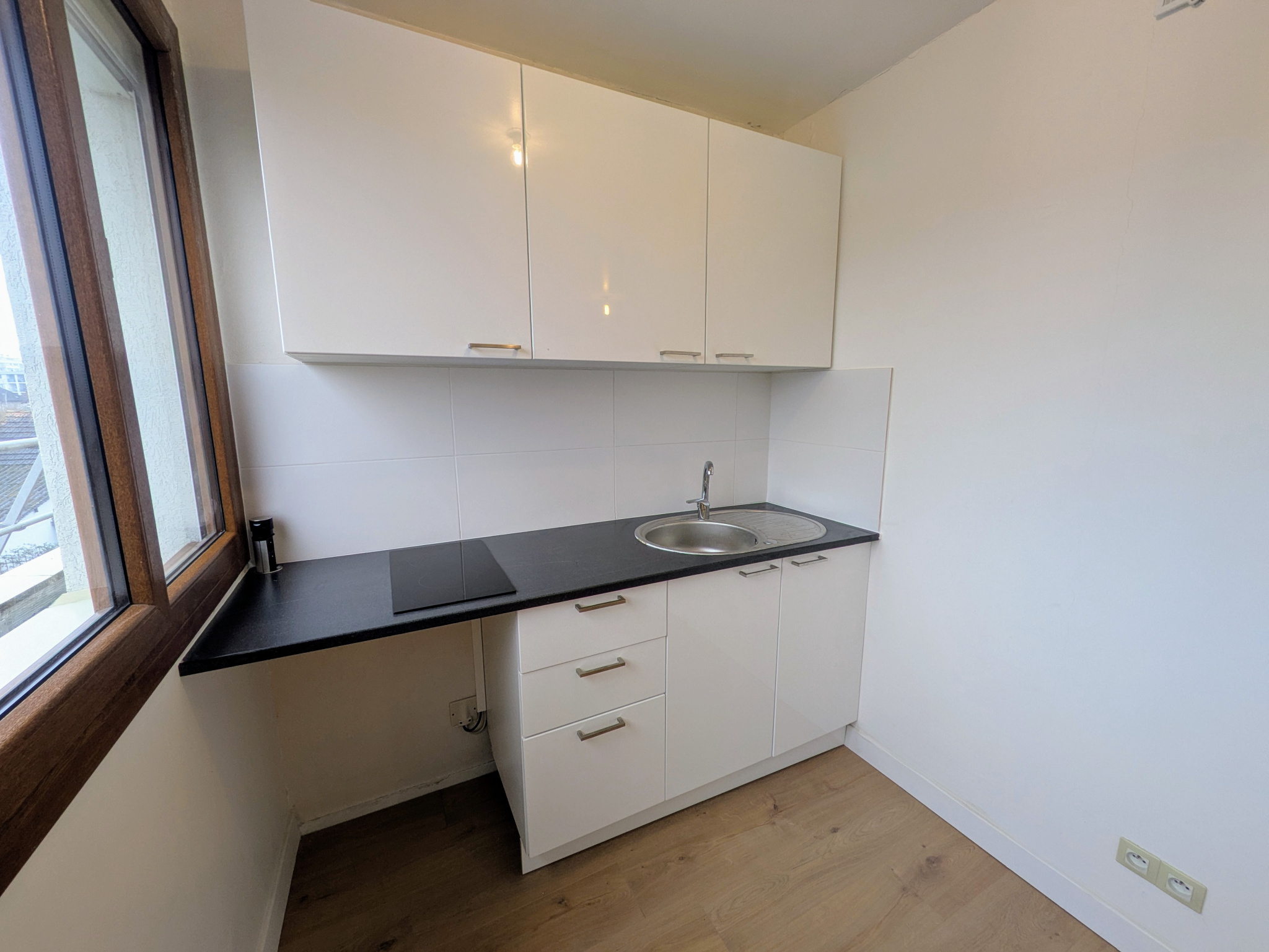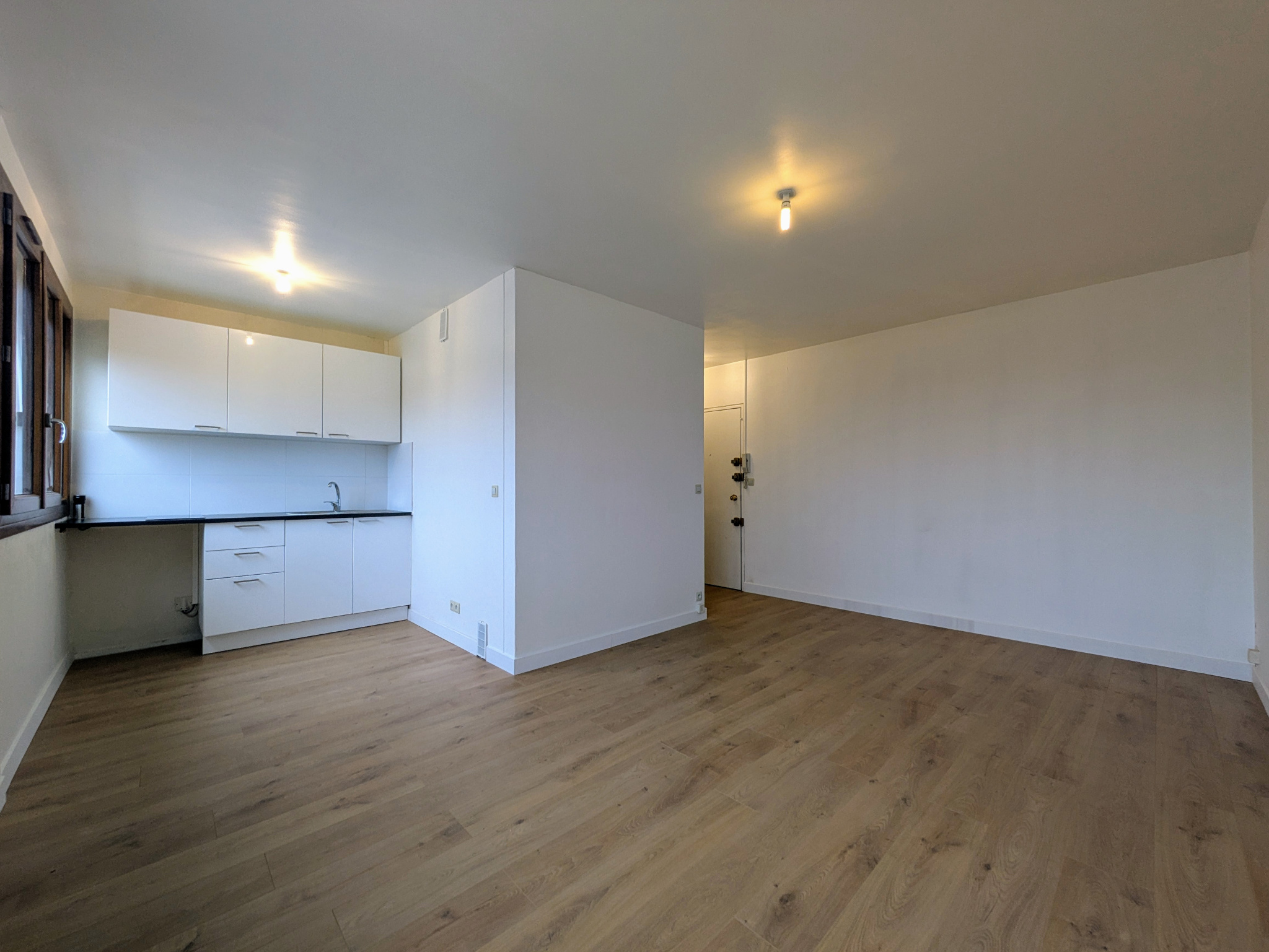 Studio d'une superficie d'environ 20 m² composé d'une entrée, cuisine aménagée et équipée (plaque, four combi, réfrigérateur, rangements), pièce de vie, salle d'eau et wc.