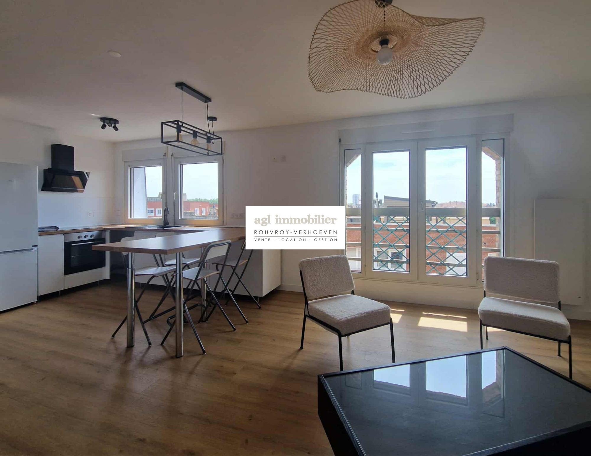 une pièce de vie lumineuse avec cuisine aména...