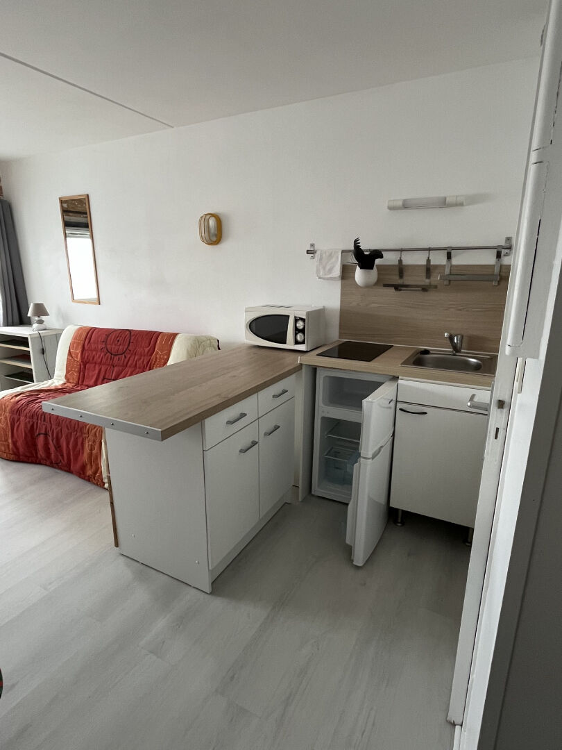 L'appartement se compose d'une pièce de vie ouverte sur une cuisine aménagée et équipée (plaque électrique, frigo, micro-onde), d'une salle d'eau avec WC.