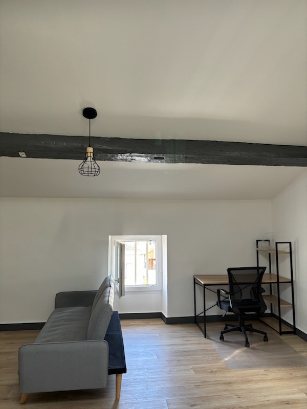 Joli studio meublé au 2èeme étage d'un immeuble en pierres, situé en plain centre de Podensac. Libre au 01/05/2026.
