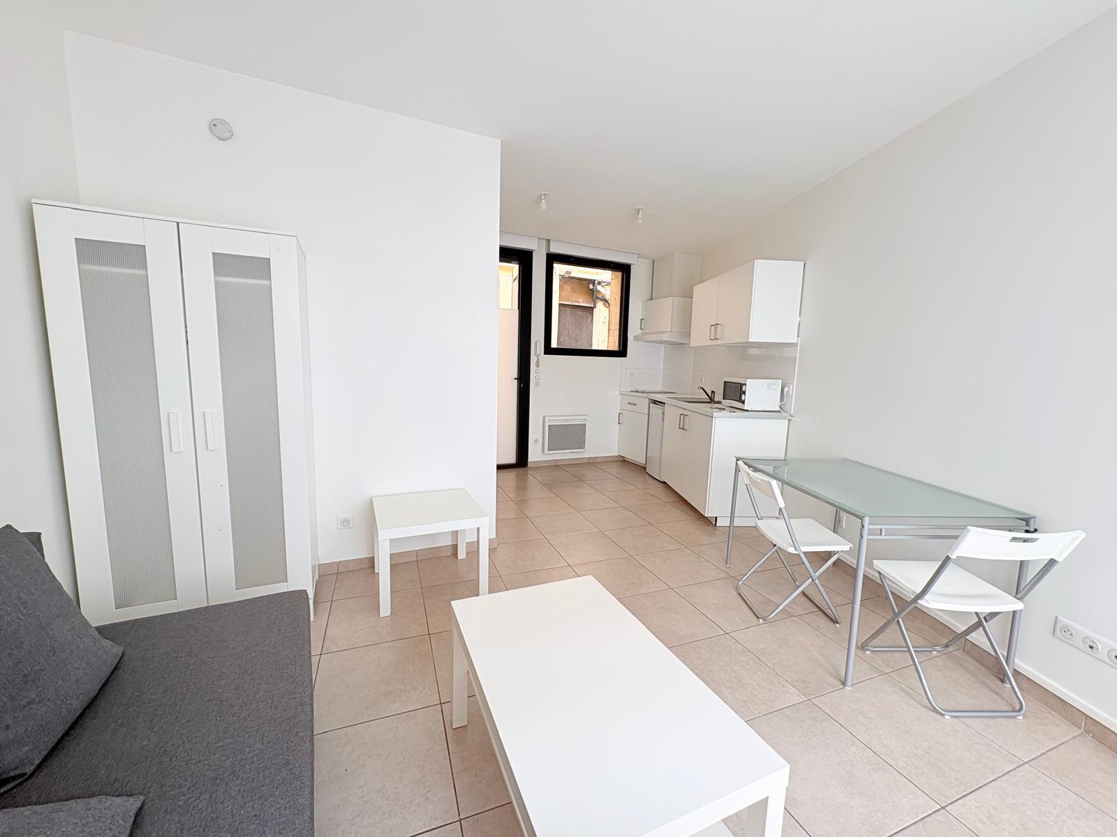 Studio de 21 m2 meublé avec balcon : Une entrée / cuisine meublée et équipée, une belle pièce de vie lumineuse avec placard donnant sur un balcon.Une salle d'eau avec WC.Place de parking privative.Proche TRAM et commerces.DISPONIBLE LE 15 AVRIL