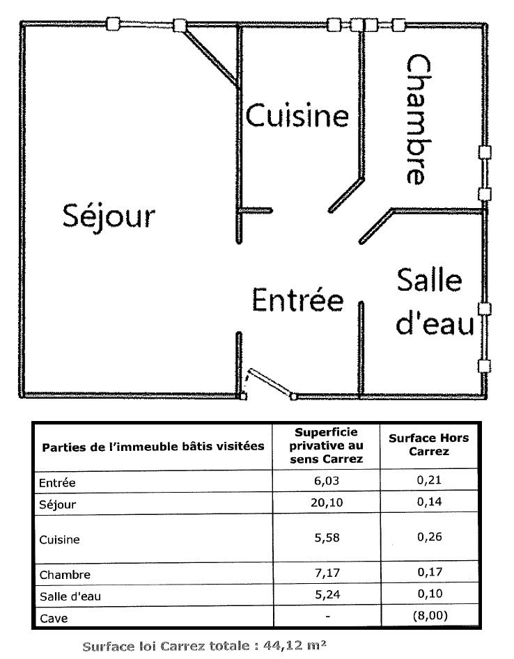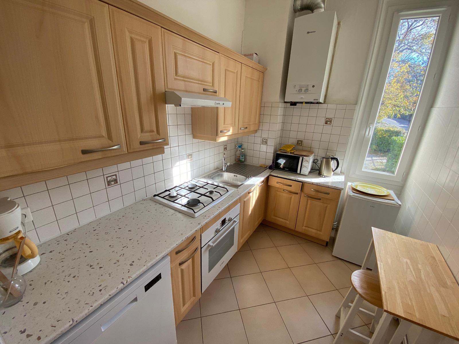 Appartement de 2 pièces composé d'une entrée avec placard, une salle de bains, un WC séparé, une chambre avec placard, un séjour très lumineux et une cuisine séparée et équipée;