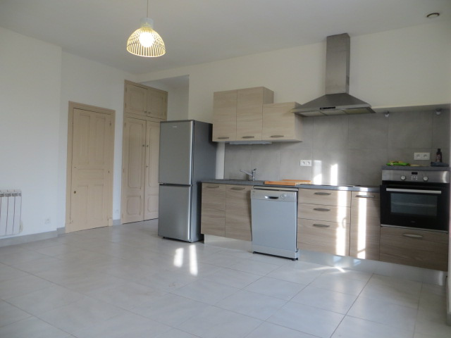 Au 1er étage d'un petit immeuble de 2 logements, bel appartement refait à neuf, comprenant une grande pièce à vivre avec cuisine ouverte aménagée et entièrement équipée, 2 chambres, un WC, et salle d'eau.
