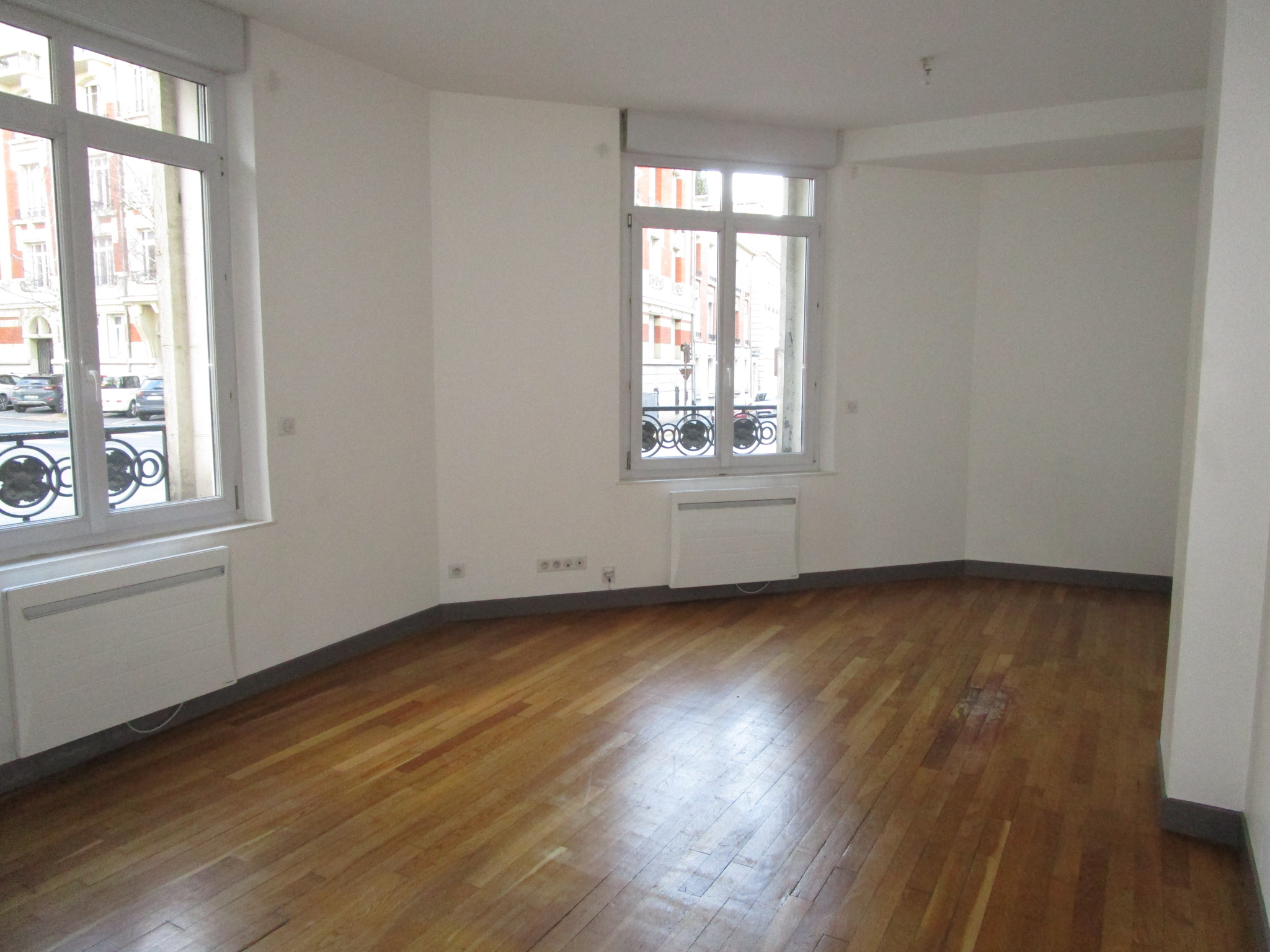 Hyper centre, un appartement T3 de 56 m2 au 1er étage offrant un séjour, une cuisine meublée et équipée, une salle de douches avec WC, un dégagement, 2 chambres et un placard.