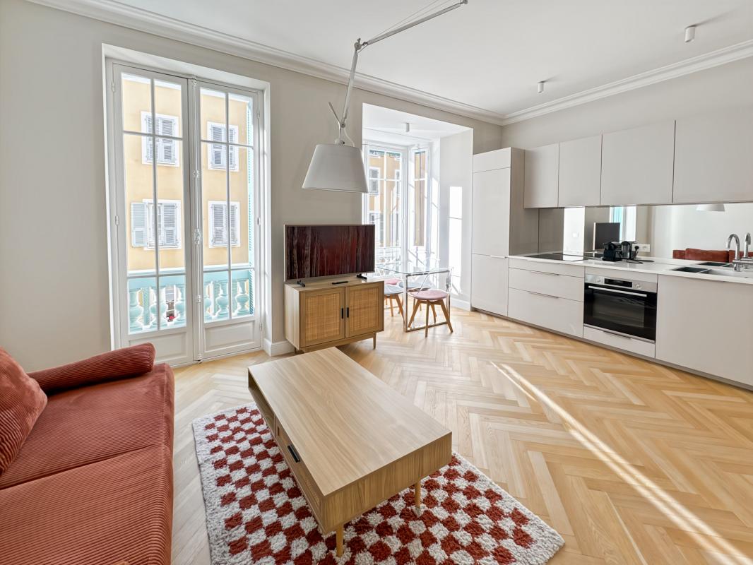 Au coeur du Carré d'Or, à deux pas de la Promenade des Anglais et de la zone piétonne, découvrez ce magnifique appartement de type F1 de 32 m², entièrement rénové avec goût et loué meublé et équipé.