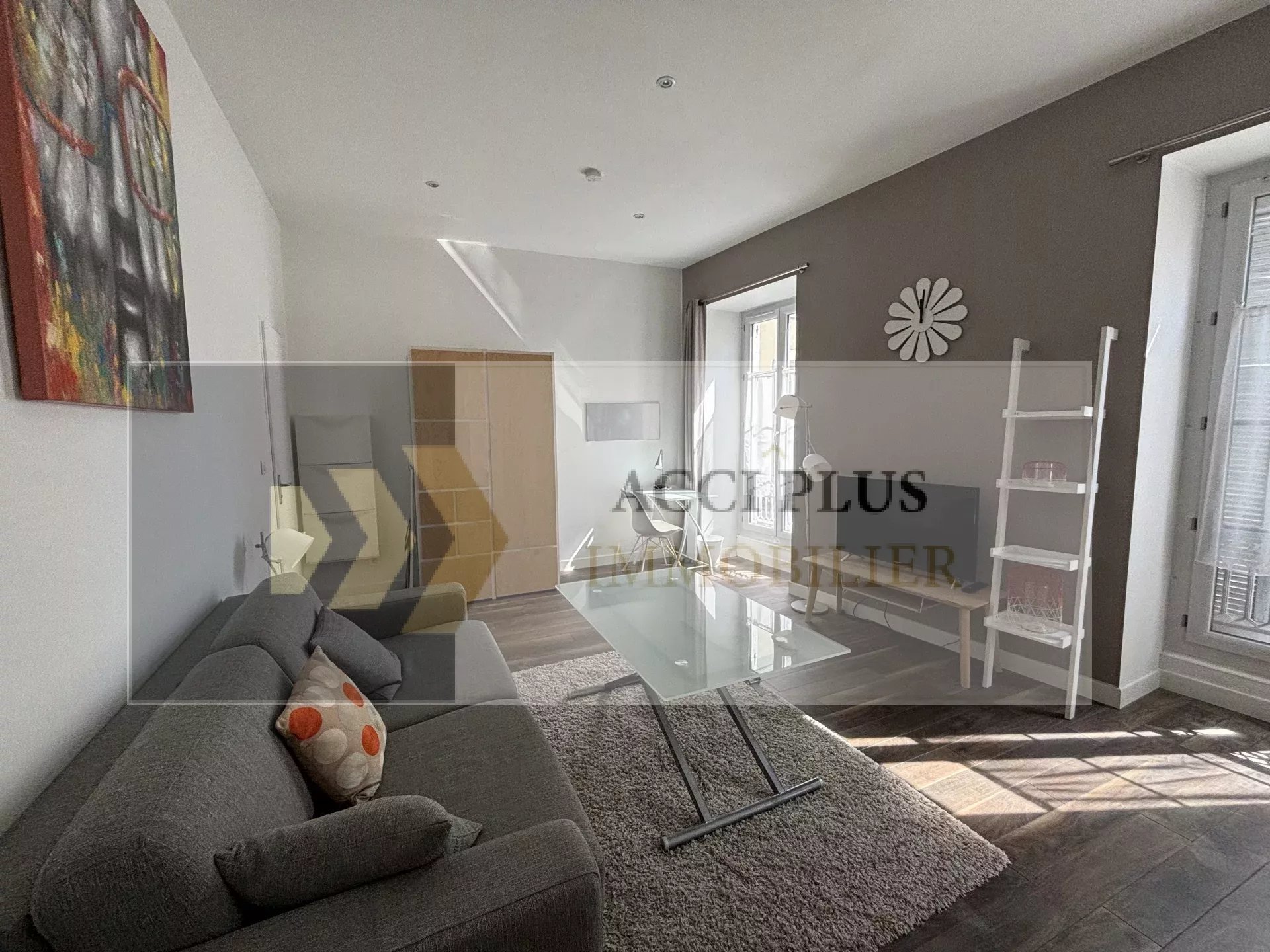 Agréable P1 meublé, très bien exposé et ensoleillé, d'une superficie de 17.47 m2 au 2ème étage d'un petit immeuble avec faibles charges, composé d'un séjour/kitchenette et d'une salle d'eau avec WC. CLIMATISATION, Double vitrage.