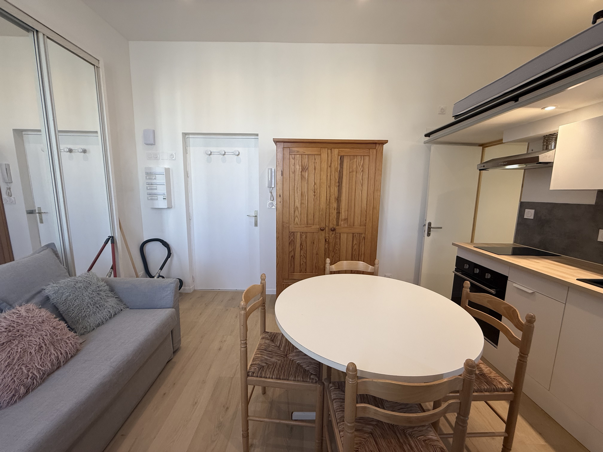 Ce studio de 19,32 m² comprend une pièce principale pré-équipée (un lit 1 place, un bureau, une table, 2 chaises) et une kitche...