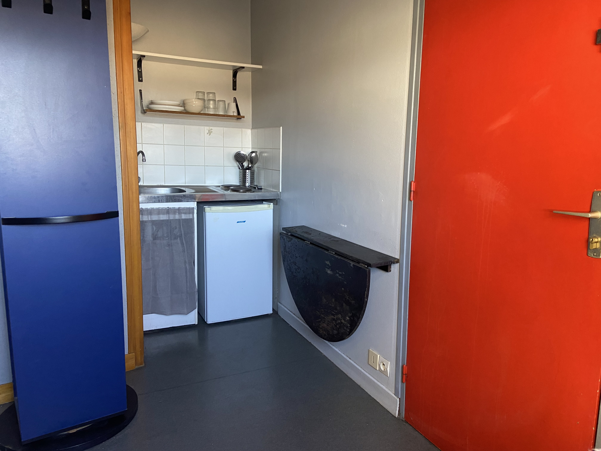 Résidence dans l'hyper centre de Reims. Une chambre meublé de 9 m2 comprenant une pièce principale avec une kitchenette et une douche. WC commun sur le palier.