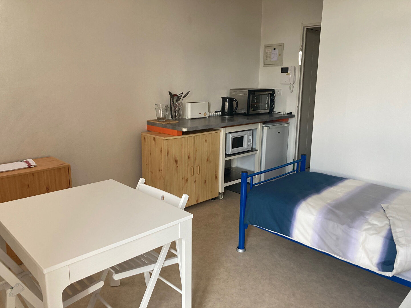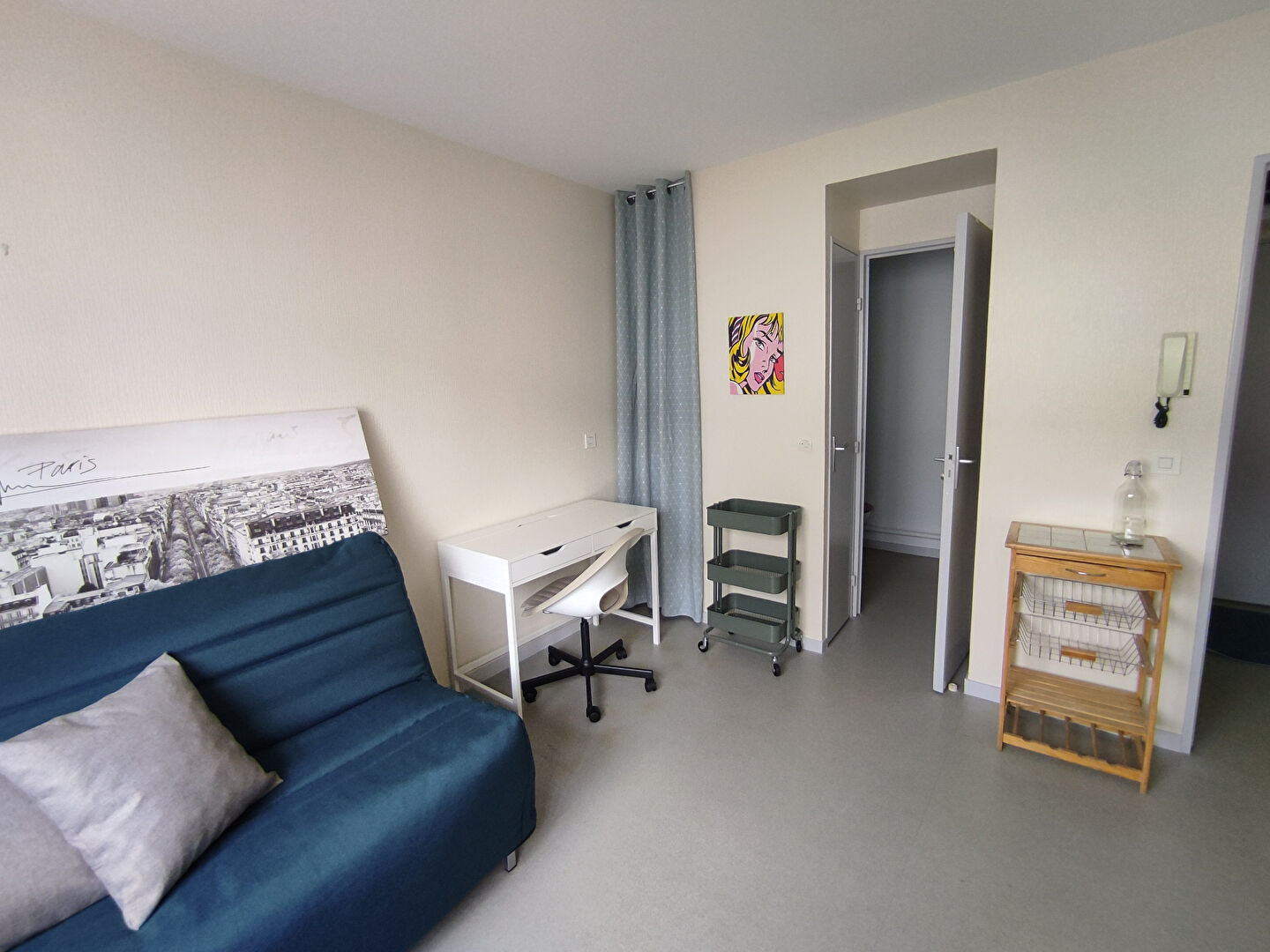 Agréable studio meublé, dans une résidence calme et sécurisée. Le studio comprend une entrée avec placard aménagé, séjour, kitchenette équipée (frigo, congélateur, plaques, four...