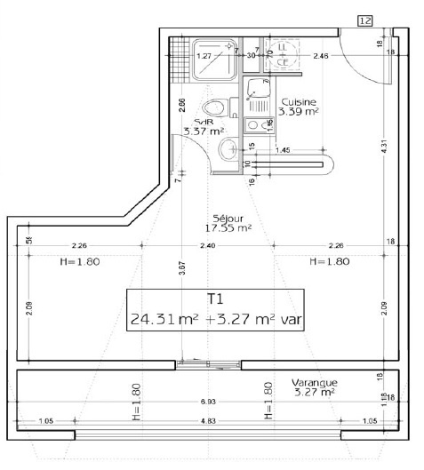 Il comprend une pièce principale avec kitchenette ouvert sur un balcon, une salle d'eau avec WC.