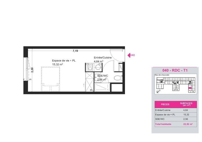 Studio de 17.28 m², situé au rez-de-chaussée de la résidence, avec place de parking incluse.