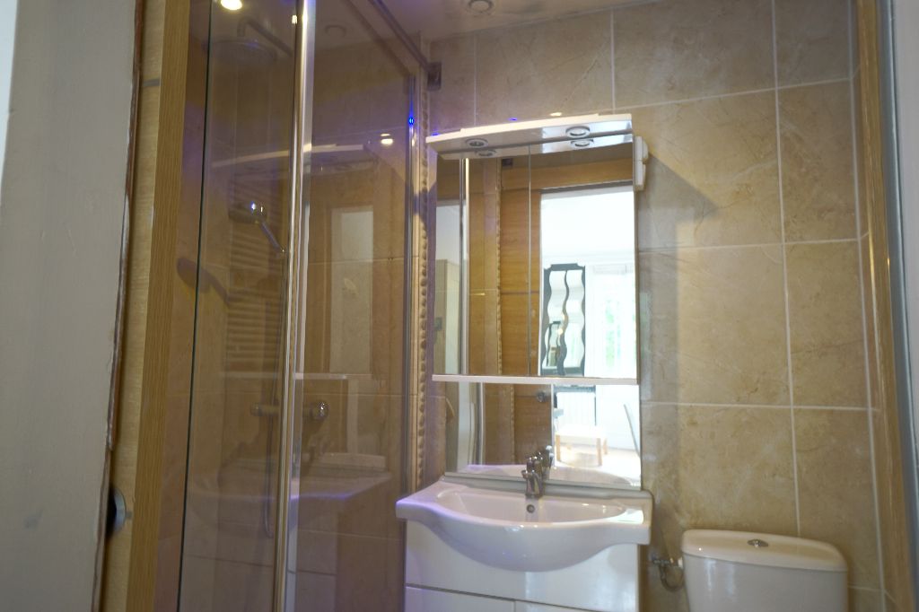 Séjour avec grand placard/penderie, espace cuisine équipée (plaque électrique, réfrigérateur, évier), salle d'eau (cabine de douche, lavabo et ...