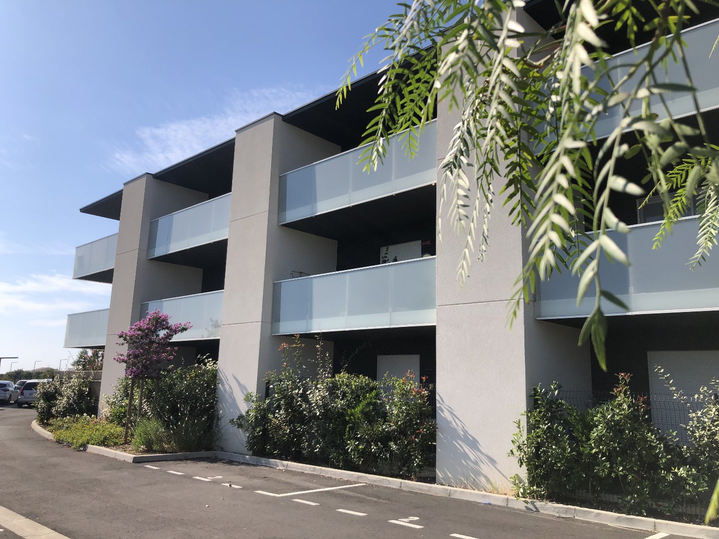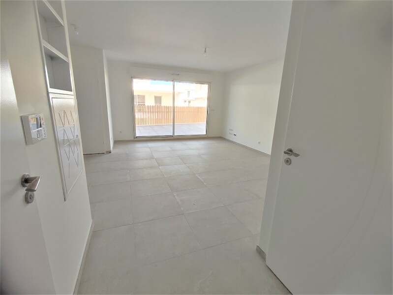 Au Jardin de Sérignan, en rez de jardin/ terrasse d'une résidence récente, appartement de type 3 avec cuisine aménagée ouverte sur séjour, cellier, salle d'eau, wc, chauffage électrique, parking sécurisé.