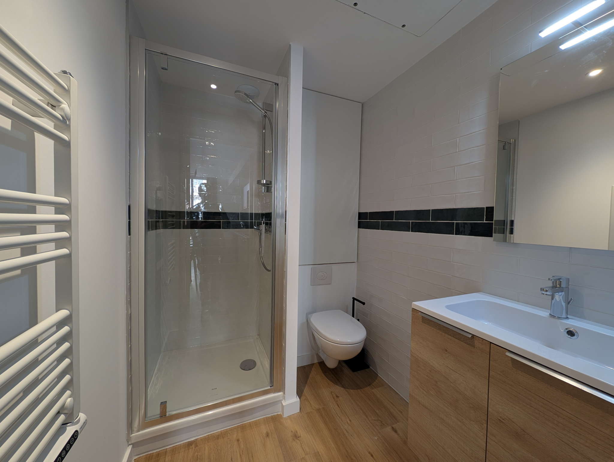 Entrée avec placard, séjour avec kitchnette, chambre avec placard, salle de bain, WC