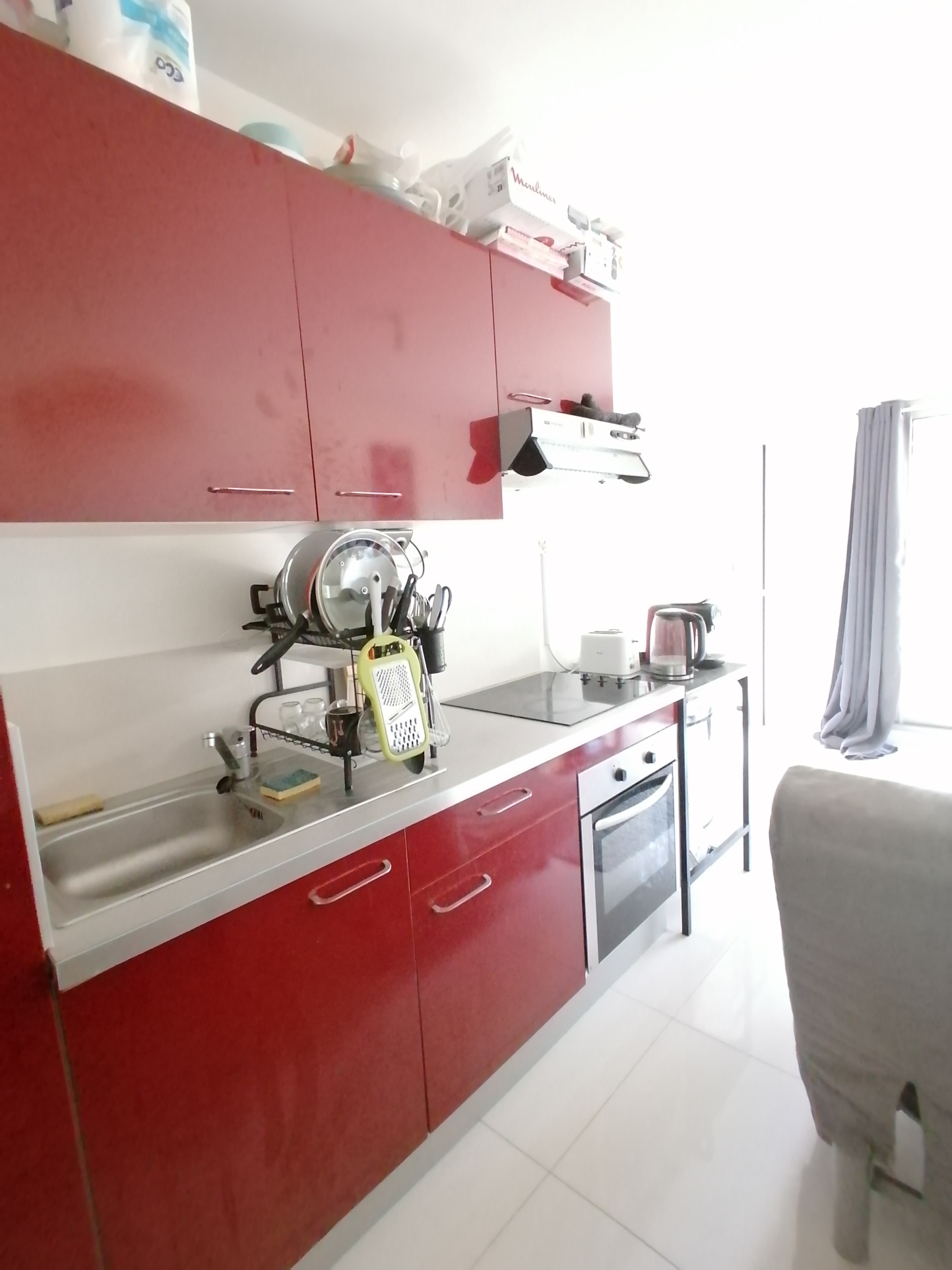 le studio comprend une pièce de vie avec lit 160x190 table chaise télévision meuble de rangement, ouvert sur la cuisine comprenant plaque de cuisson hotte micro-ondes, ...