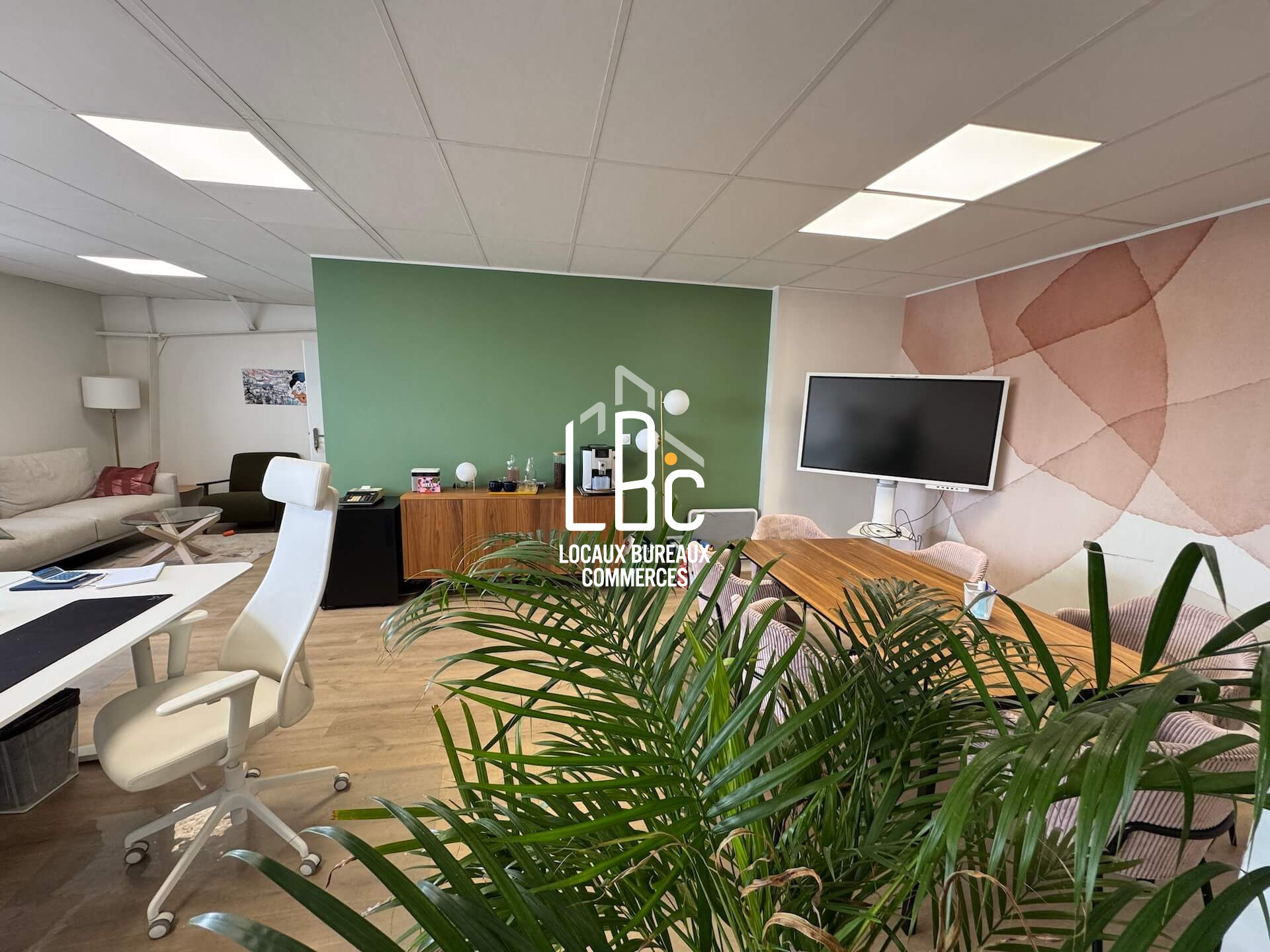 Espace bureau de 9m² comprenant meuble de bureau et fauteuil, au sein d'un espace tertiaire avec espace communs de 13.55 m² comprenant cuisine équipé, salle de réunion, sanitaire, terrasses