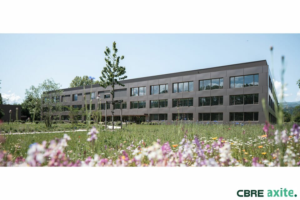 MEYLAN Inovallée, CBRE Axite vous propose à la location au sein d'un parc de 2 hectares équipé d'espace kiosque avec Wifi, un bel immeuble de standing d'une superficie totale d'environ 7 400 m² divisibles à partir de 154 m².Le bâtiment béné...