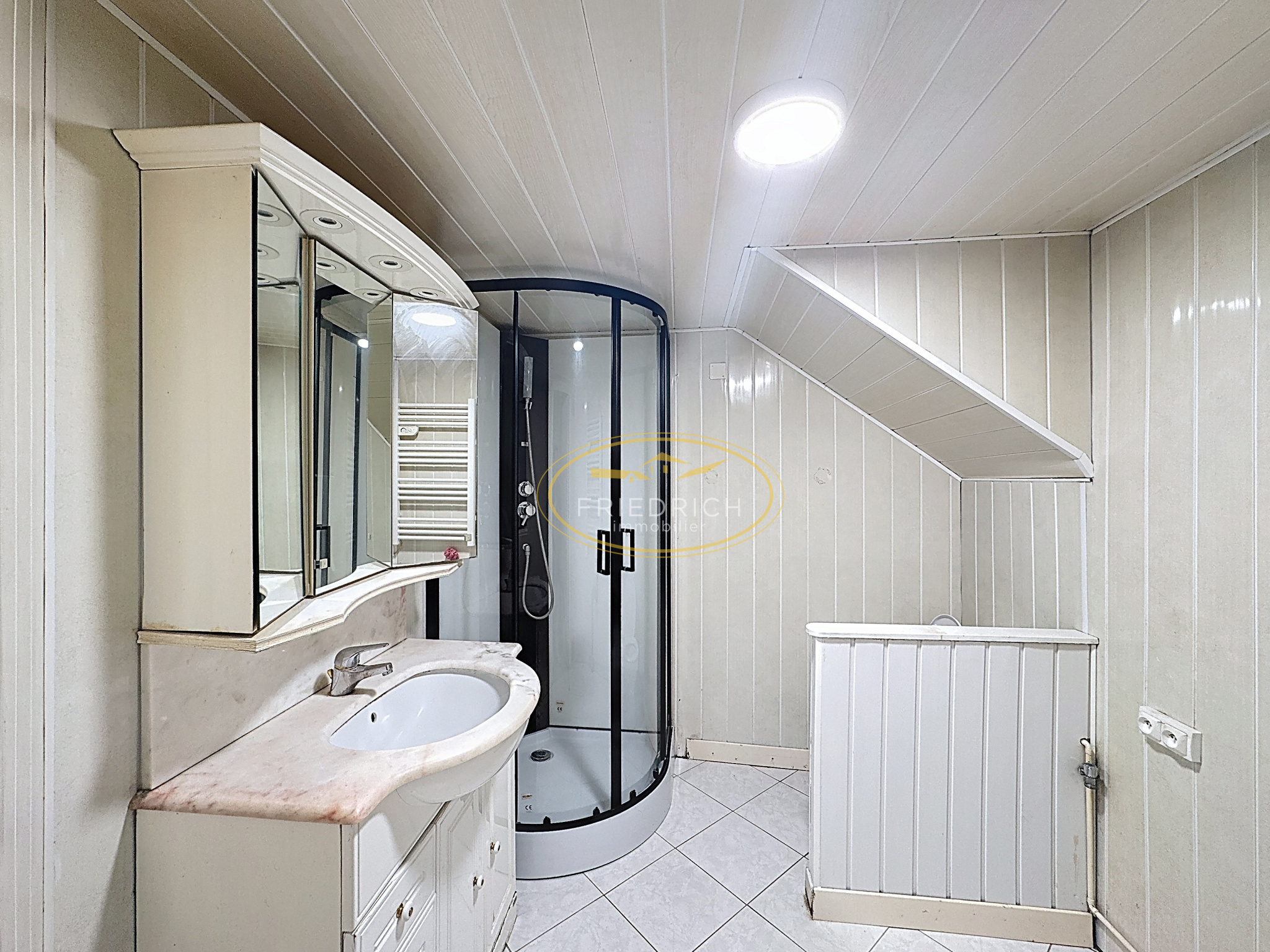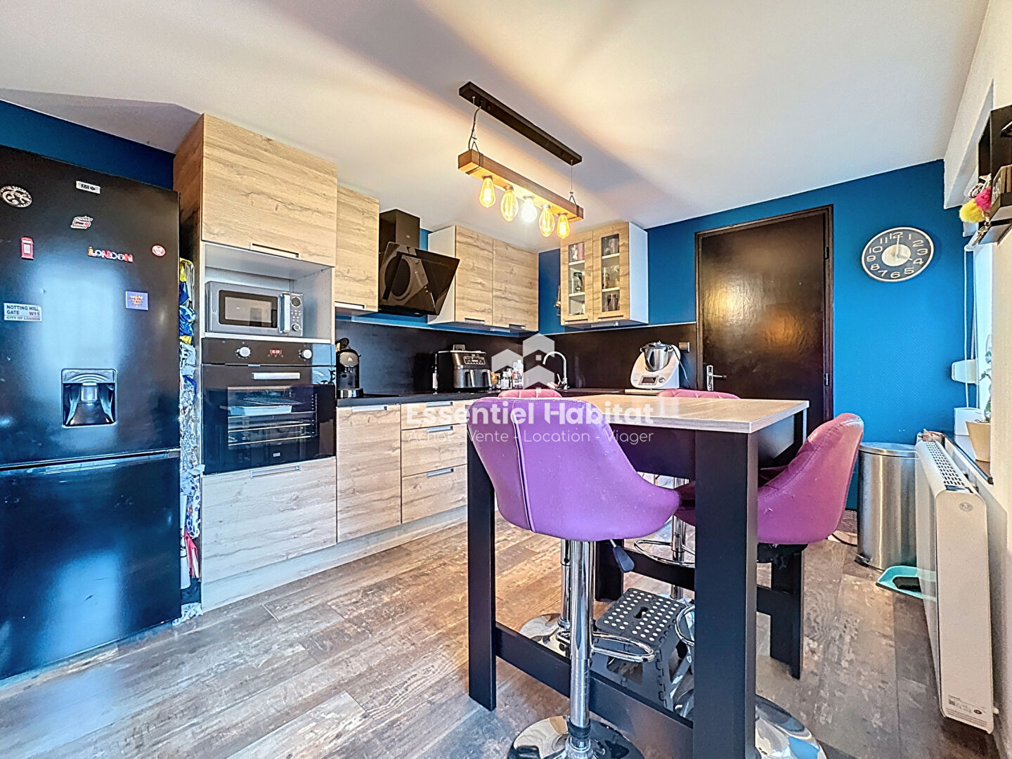 Cuisine ouverte sur la pièce de vie, salon, salle d'eau, wc.