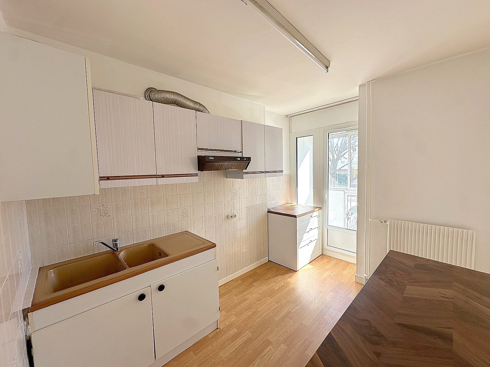 Cuisine équipée et aménagée avec accès balcon, 2 chambres, possibilité d'une 3è, grand salon séjour, wc, salle d'eau, cellier.