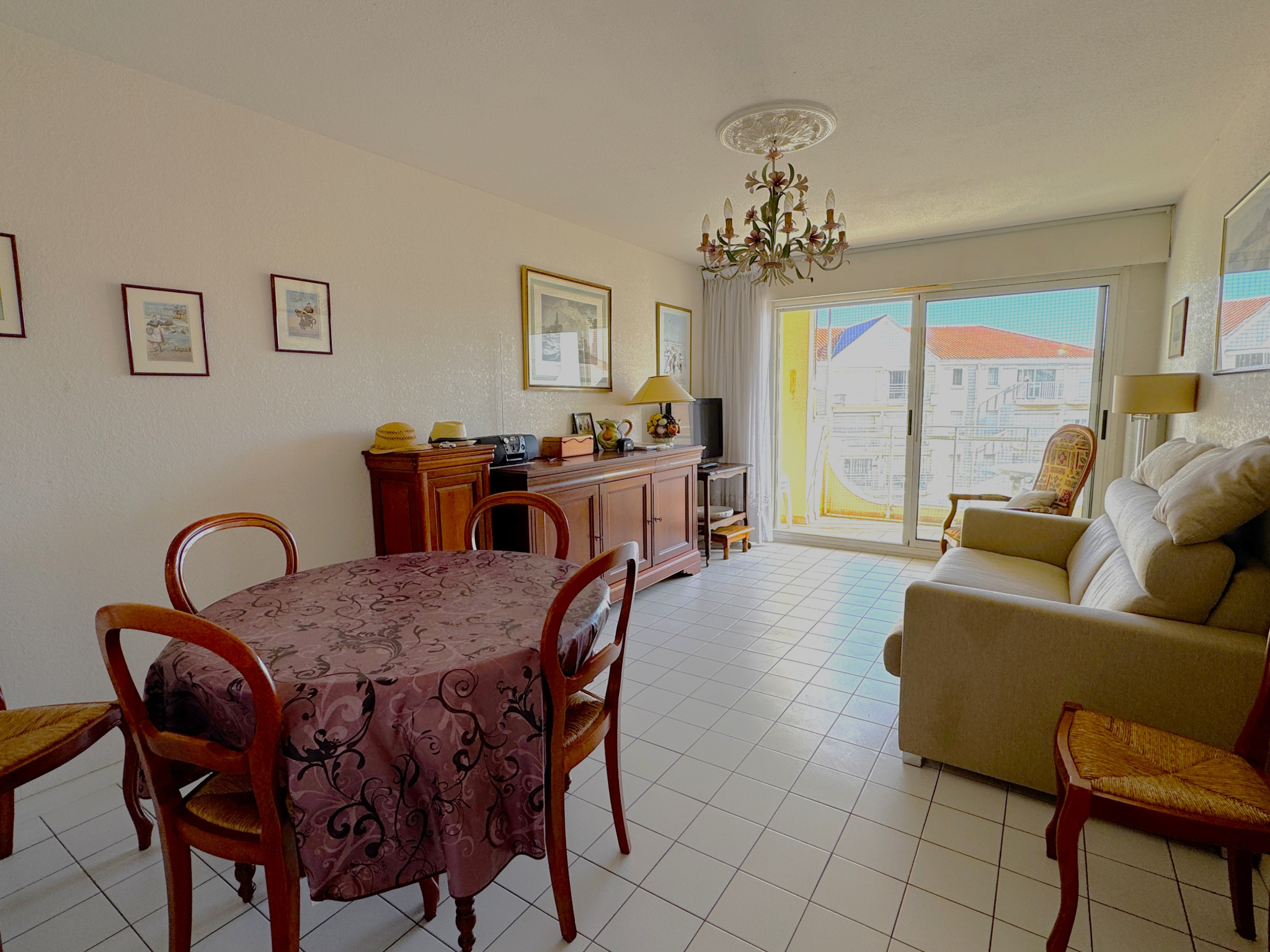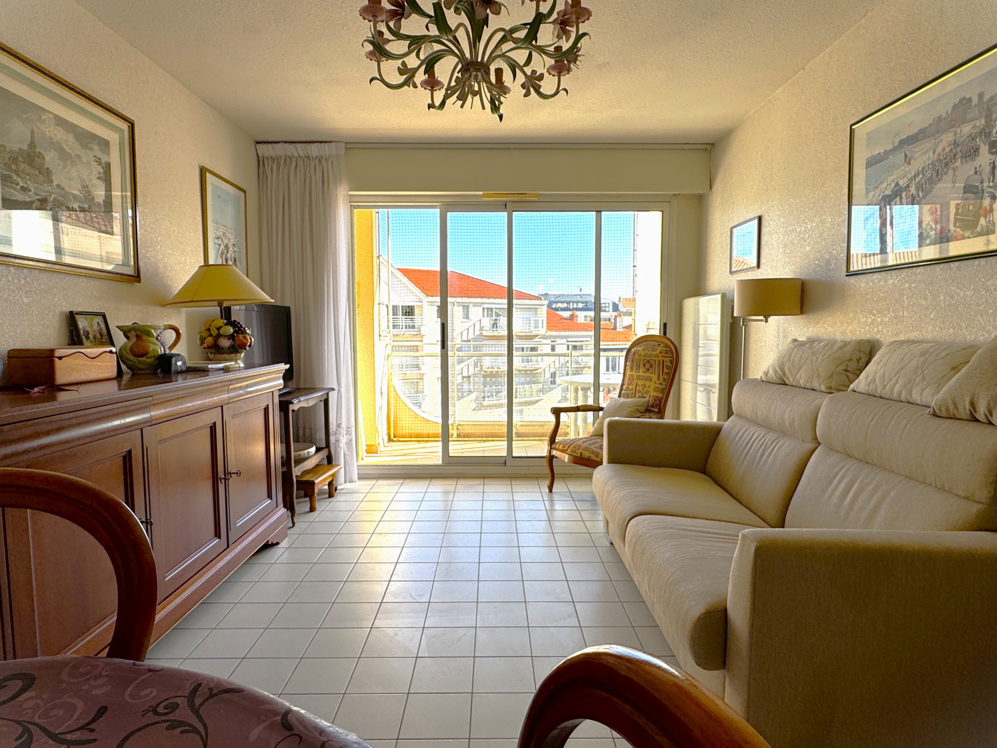 A deux pas de la plage de Tanchet et des commerces du quartier des Présidents, appartement avec vue latérale mer offrant entrée avec couchageS pour deux personnes, salle d'eau avec wc, séjour avec coin cuisine, balcon avec vue latéreale mer.