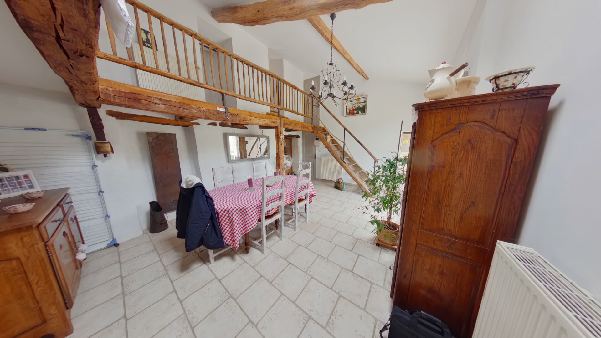 - Au rez-de-chaussée : une cuisine/salle à manger, un salon, une chambre, une salle de bains et des toilettes.