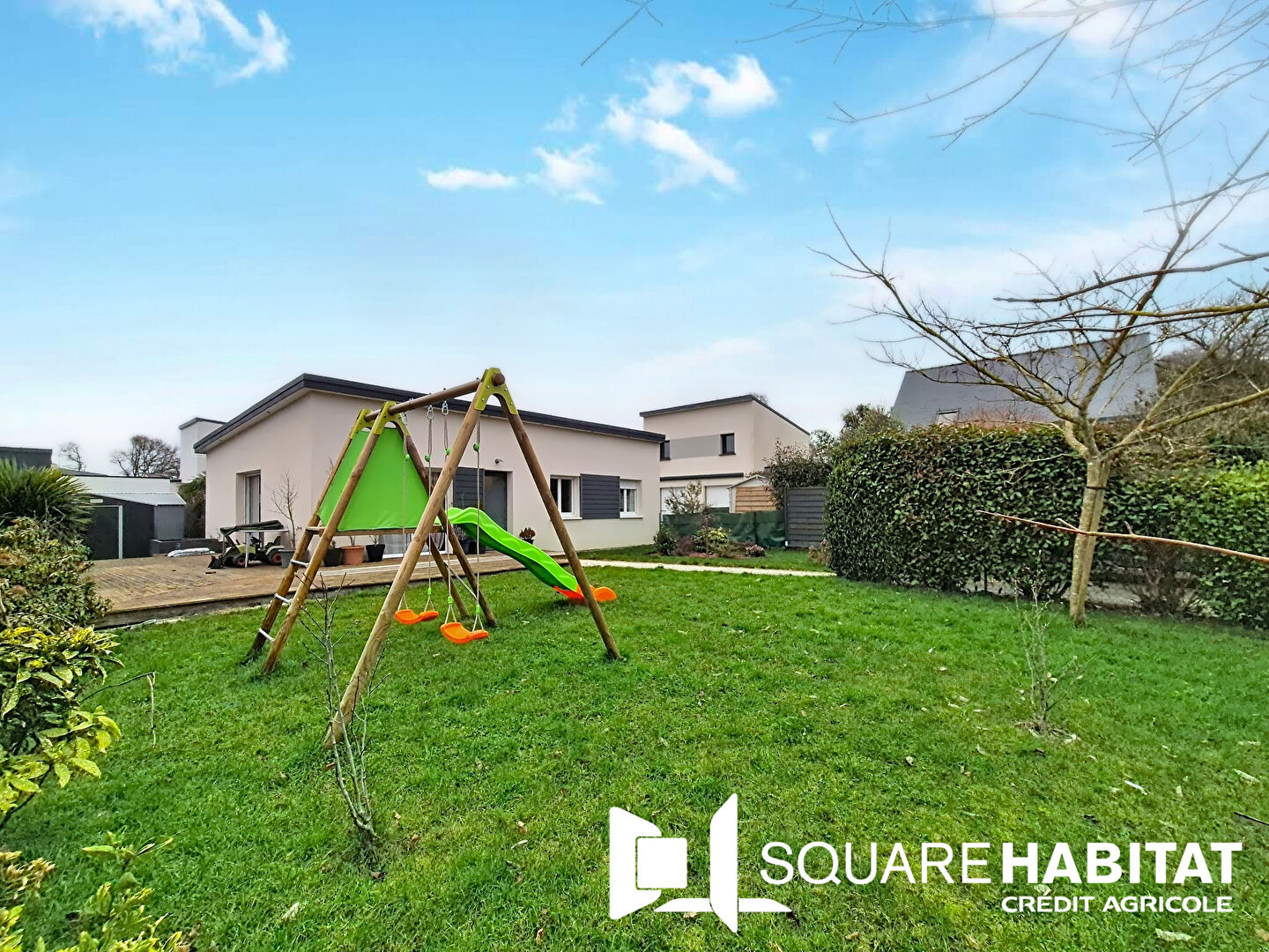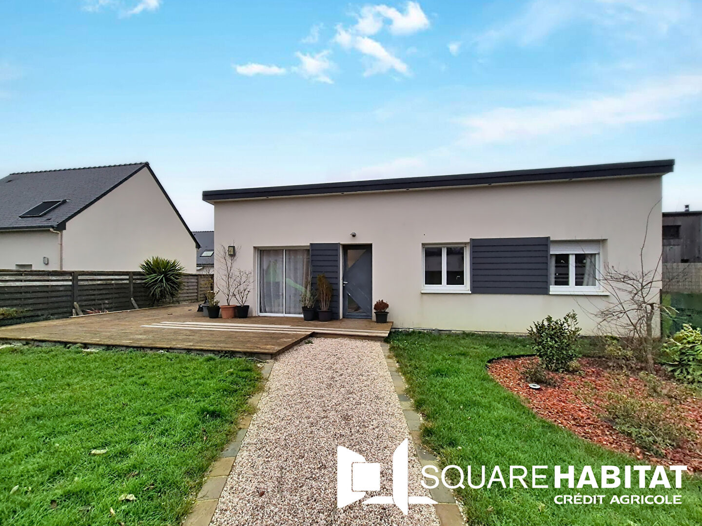Maison contemporaine de plain pied, cosy et disposant de la fibre sur un terrain clos et paysagé de plus de 400 m² à 700 mètres du coeur de ville.