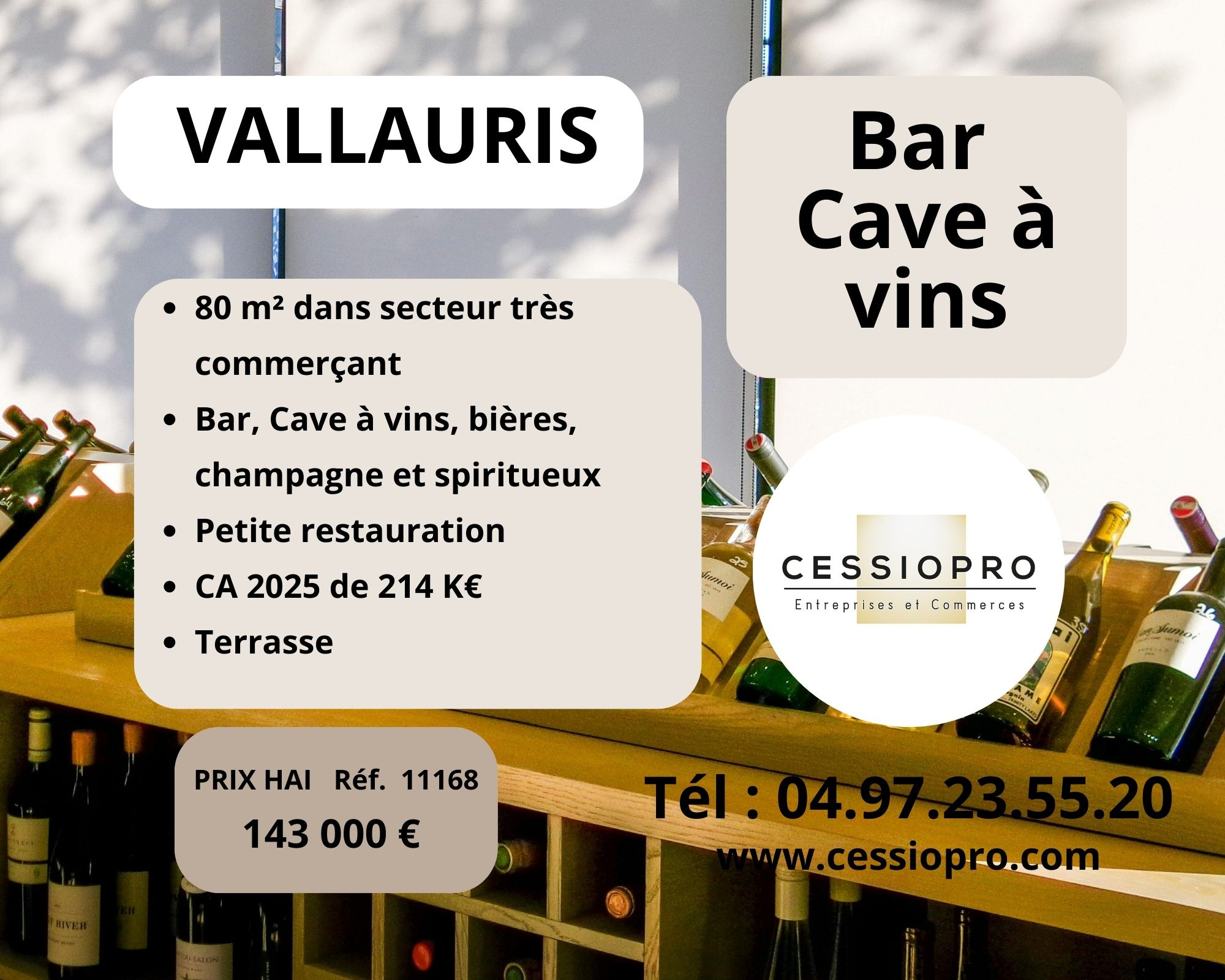 Bar et cave à vin, bières, champagne et spiritueux, petite restauration, terrasse, bon CA - Vallauris