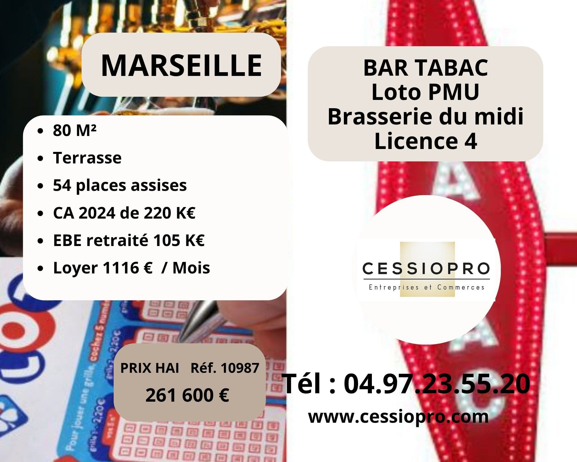 Affaire à saisir !!! A vendre Bar Tabac Loto PMU, Brasserie du midi, Licence 4, avec Terrasse, sur Marseille