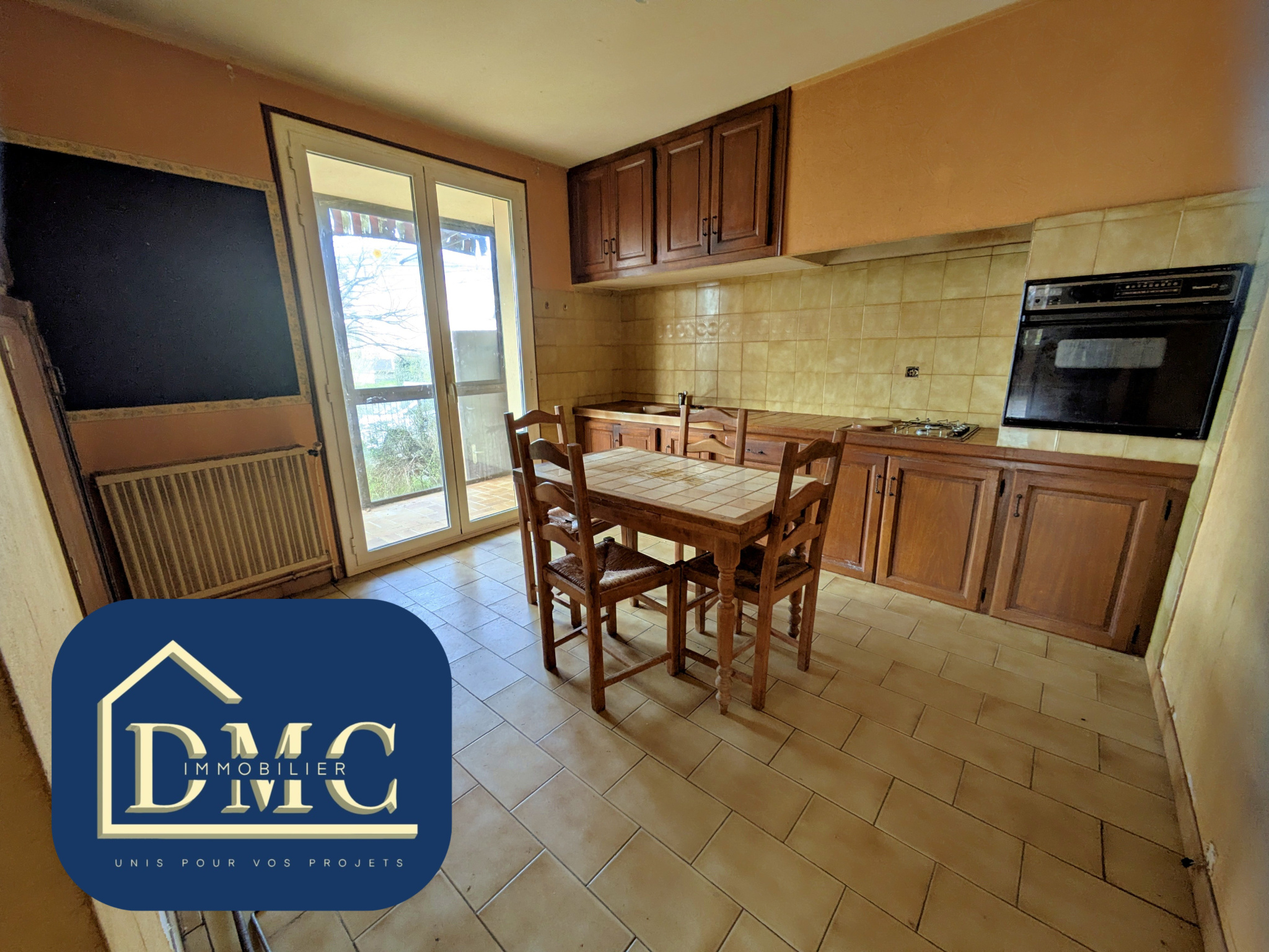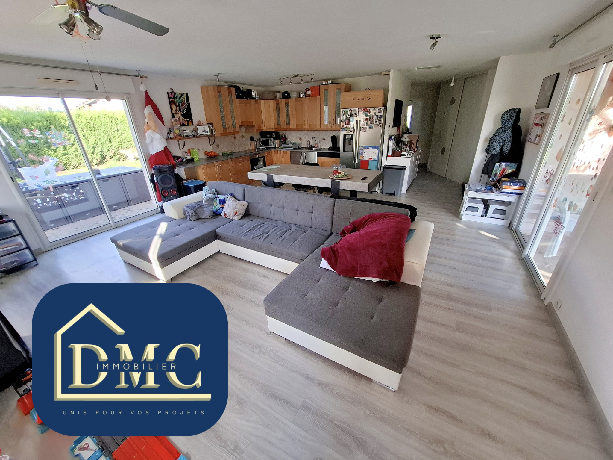une pièce de vie lumineuse avec cuisine ouverte donnant sur un espace extérieur entièrement cl...