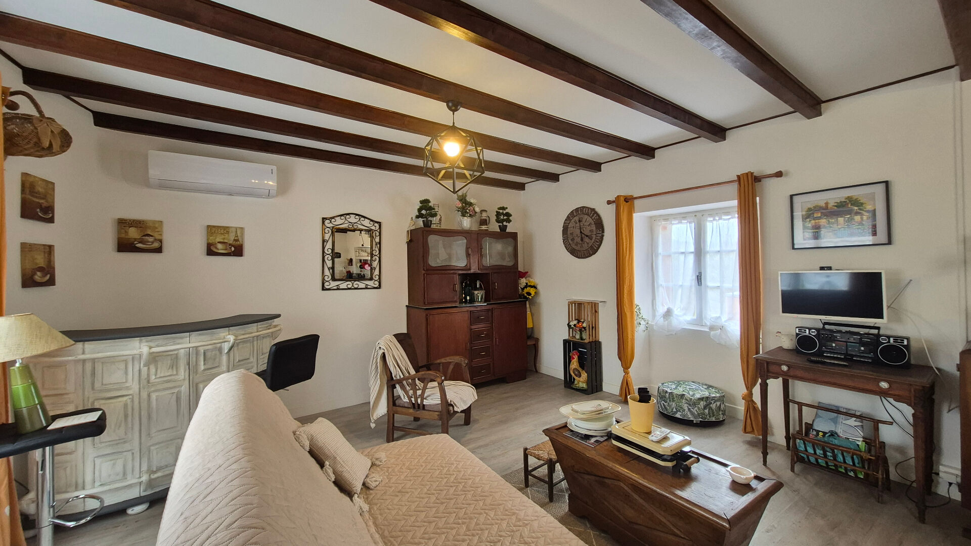 - Etage : env 30 m² dont séjour avec cheminée ouverte + partie cuisine, Wc (cloisons bois)