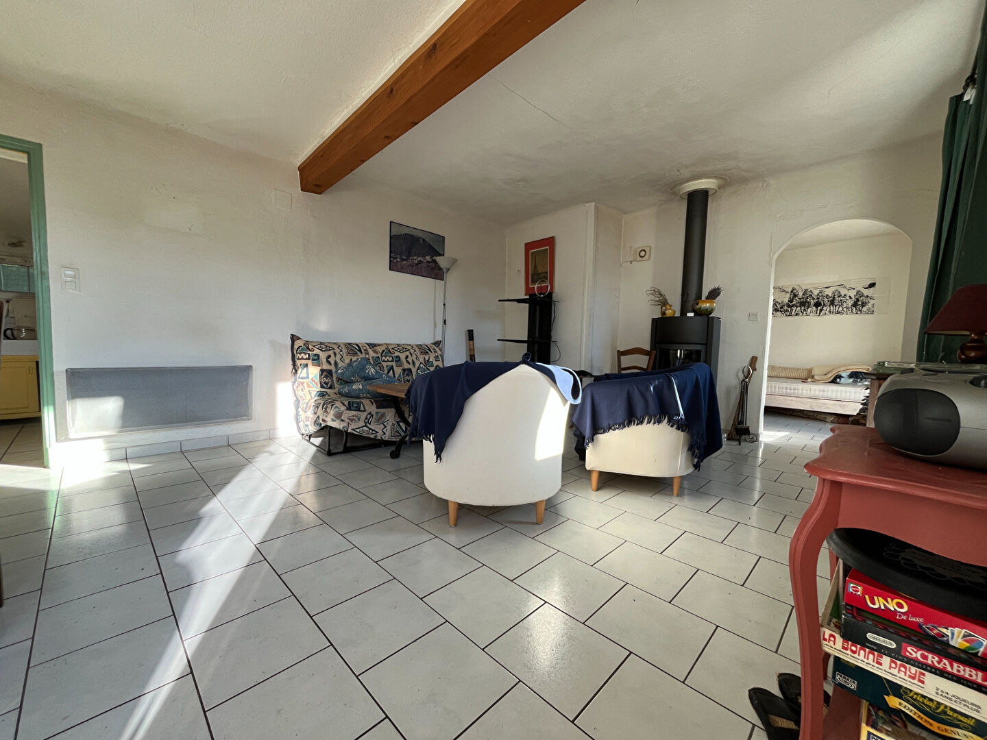 Au 1er niveau une pièce à vivre dotée d'un poêle à bois, cuisine équipée. WC séparé.