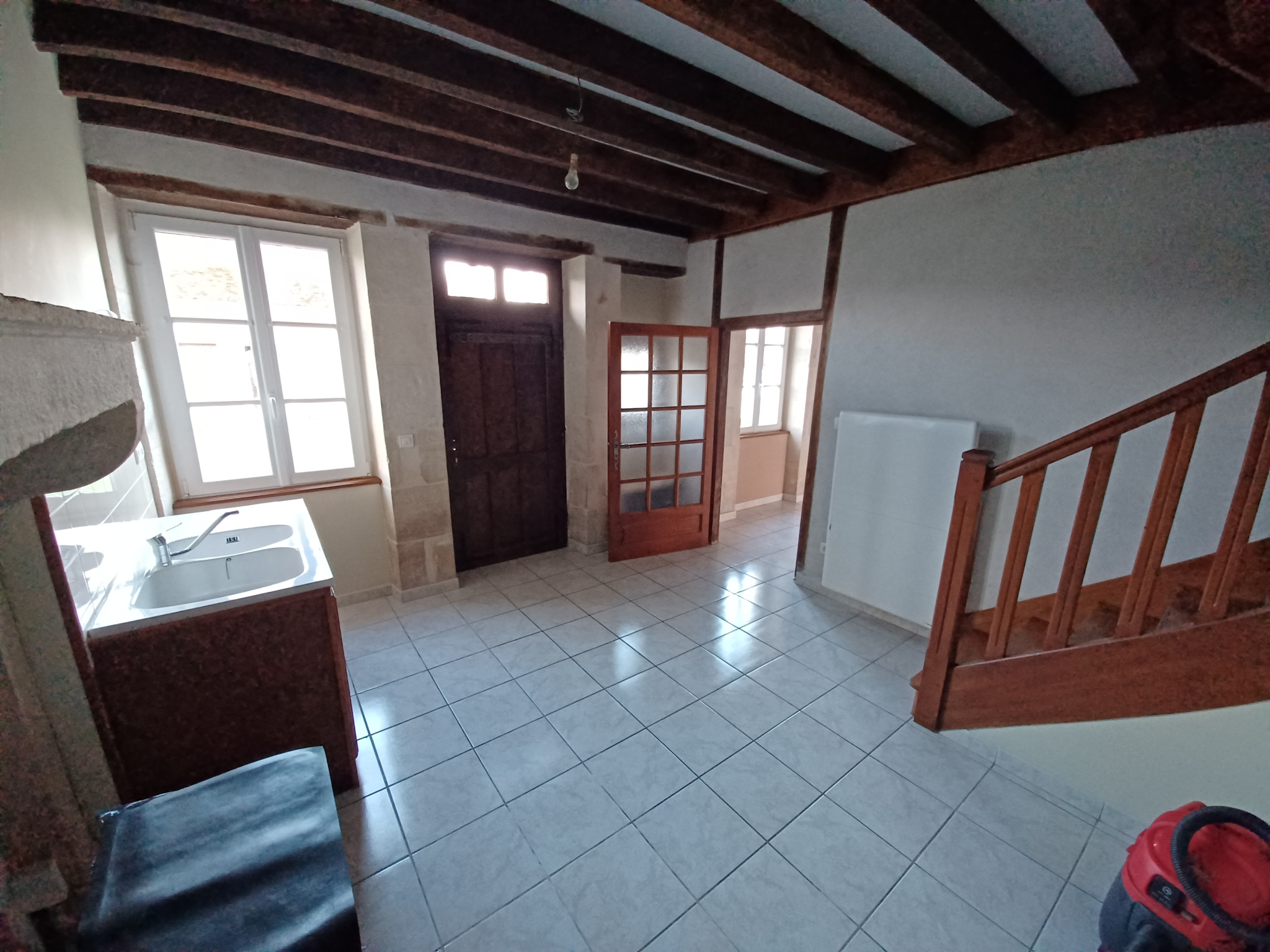 Maison comprenant de plain pied un séjour carrelé d'env 24m2 avec cheminée, poutres, pierres apparentes, une cuisine séparée avec ...