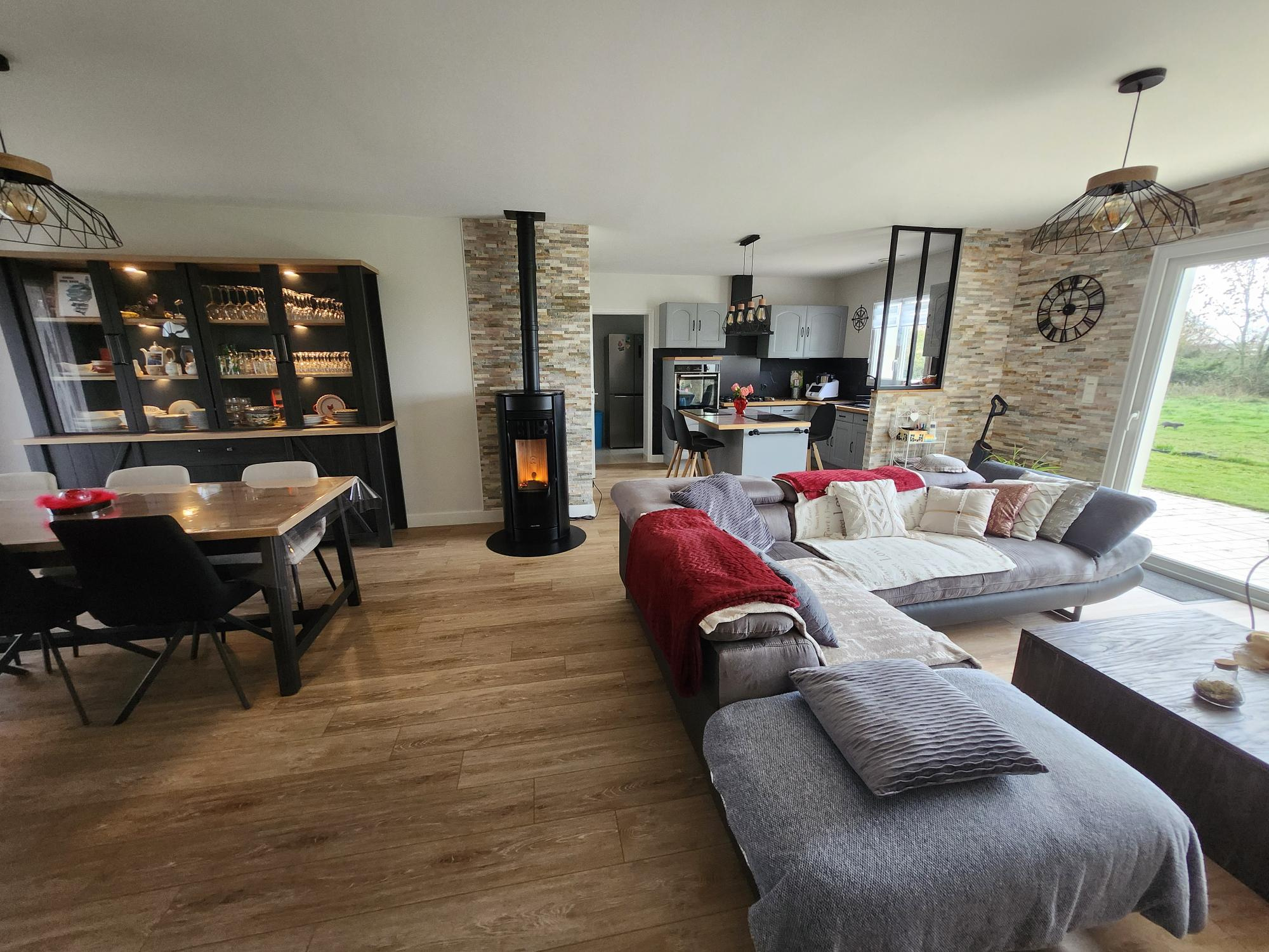 Longère de charme début 20ème, rénovée, elle dispose d'une belle pièce de vie avec entrée séjour salon avec poële à bois, cuisine aménagée, cellier, une chambre, un bureau...