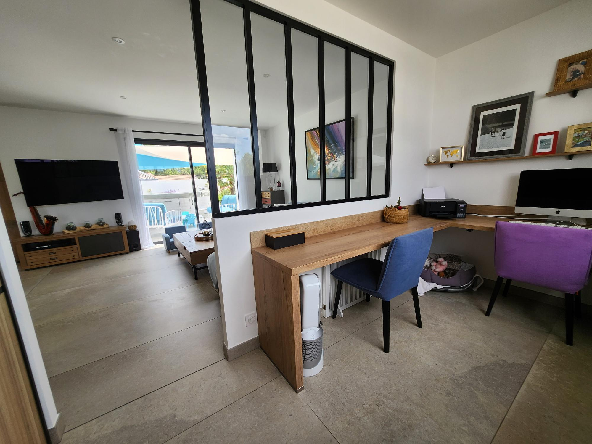 Elle comprend une pièce de vie avec cheminée insert et cuisine ouverte aménagée et équipée, deux chambres dont une vue mer, une salle d'eau, un wc, un bureau, une...