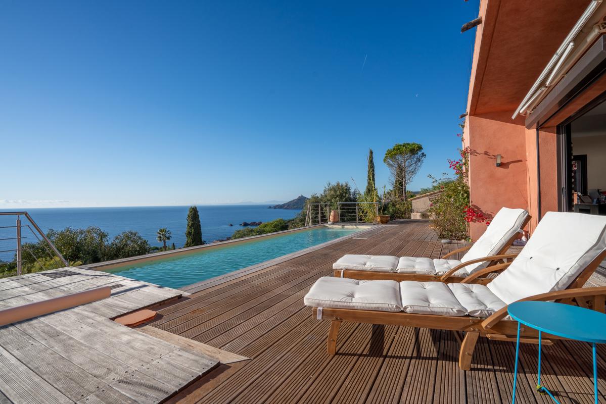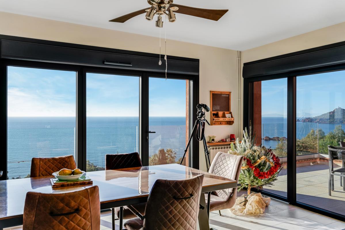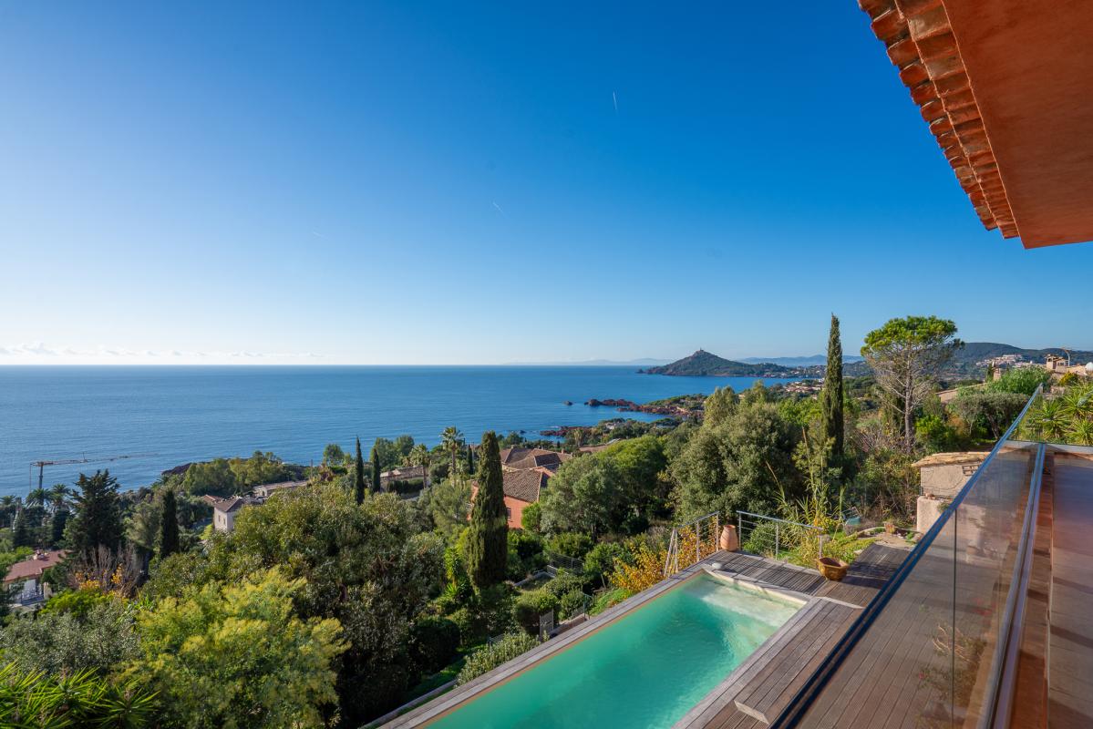 Sur les hauteurs d'Agay, cette villa d'environ 215 m² entièrement rénovée domine la Méditerranée, offrant une vue continue du lever au coucher du soleil. Les espaces de vie sont généreux et baignés de lumière, s'ouvrant sur une terrasse en surpl...